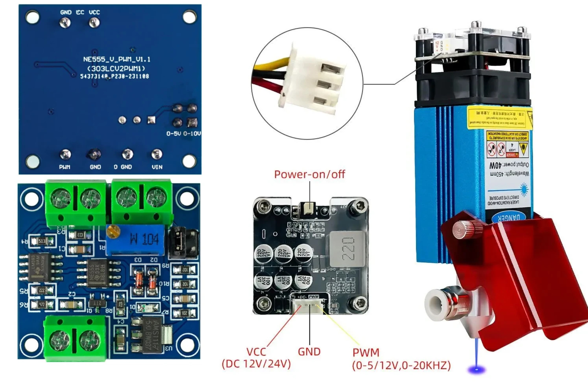 1.3. управляющий выход - сигнальный провод PWM и GND. GND отсюда можено не использовать, а вот PWM покдключить к такому же разъему PWM на лазере.