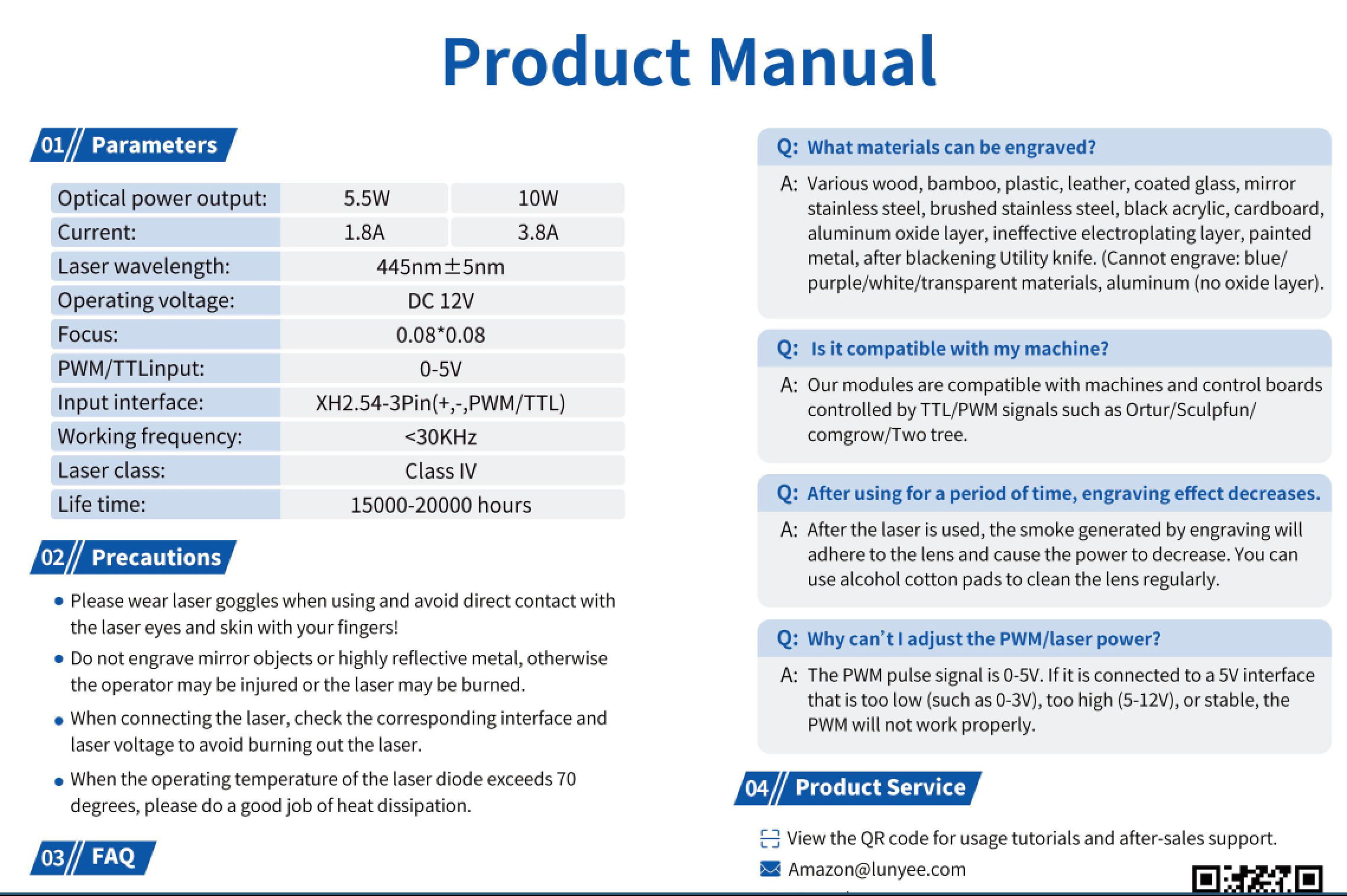 Важно - китайцы врут с характеристиками. На примере моего лазера якобы мощностью 10вт и током 3.8А реальный ток был 2.6А, т.е. примерно 75%. Вам тоже надо будет провести измерения. Для этого надо аккуратно отвинтить винты крепления платы к корпусу-радиатору лазера и разрезать один из проводов питания диодов, зачистить кончики, облудить и подключить амперметр. Надеть очки (мне повезно - купил много лет назад на барахолке еще кожанные очки сварщика со стеклянными стеклами) и включить лазер без управления мощностью, замерить ток. Выключить (кнопкой на плате) лазер. Подключить провод PWM - как только лазер почувствует подключенный сигнал PWM он перестанет включаться кнопкой на плате. теперь эта кнопка будет означать лишь включения режима готовности РЕАГИРОВАТЬ на сигнал PWM.