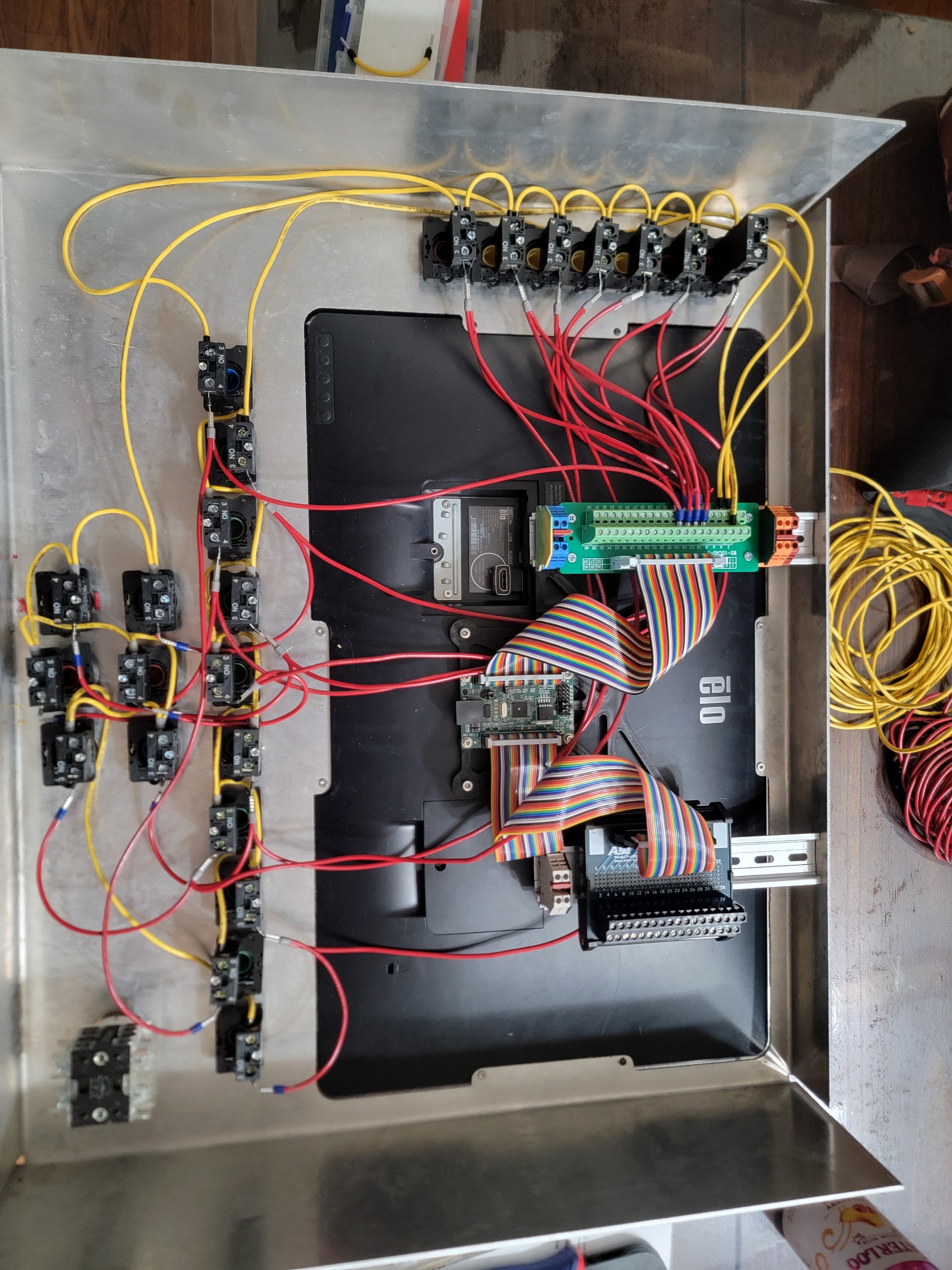 Got a bit more work done on the machines control panel. All of the buttons I currently want in it are wired in to the 7i73 so I just need to update the .hal file to use the new inputs on the button matrix. Still plan on adding buttons if needed as well as integrating my MPG and axis selector switch etc. to the panel but for now it is all wired up short of the drive enable and estop as that stuff is in the garage and I am in the house