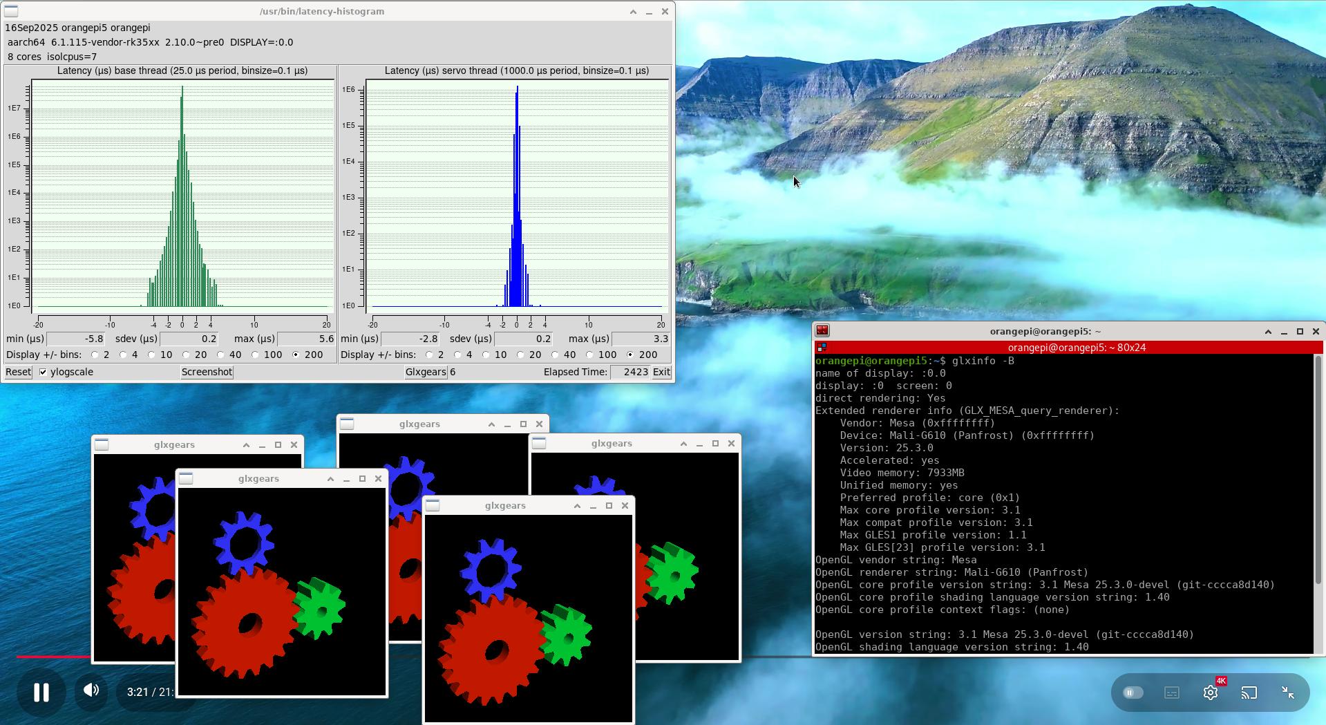 I installed linuxcnc 2.10 on orange pi5 - with armbian + rt-kernel 6.1.75. The system was made a year ago, and I installed linuxcnc 2.10 now with old versions of dependencies, to keep the 3D acceleration functional.