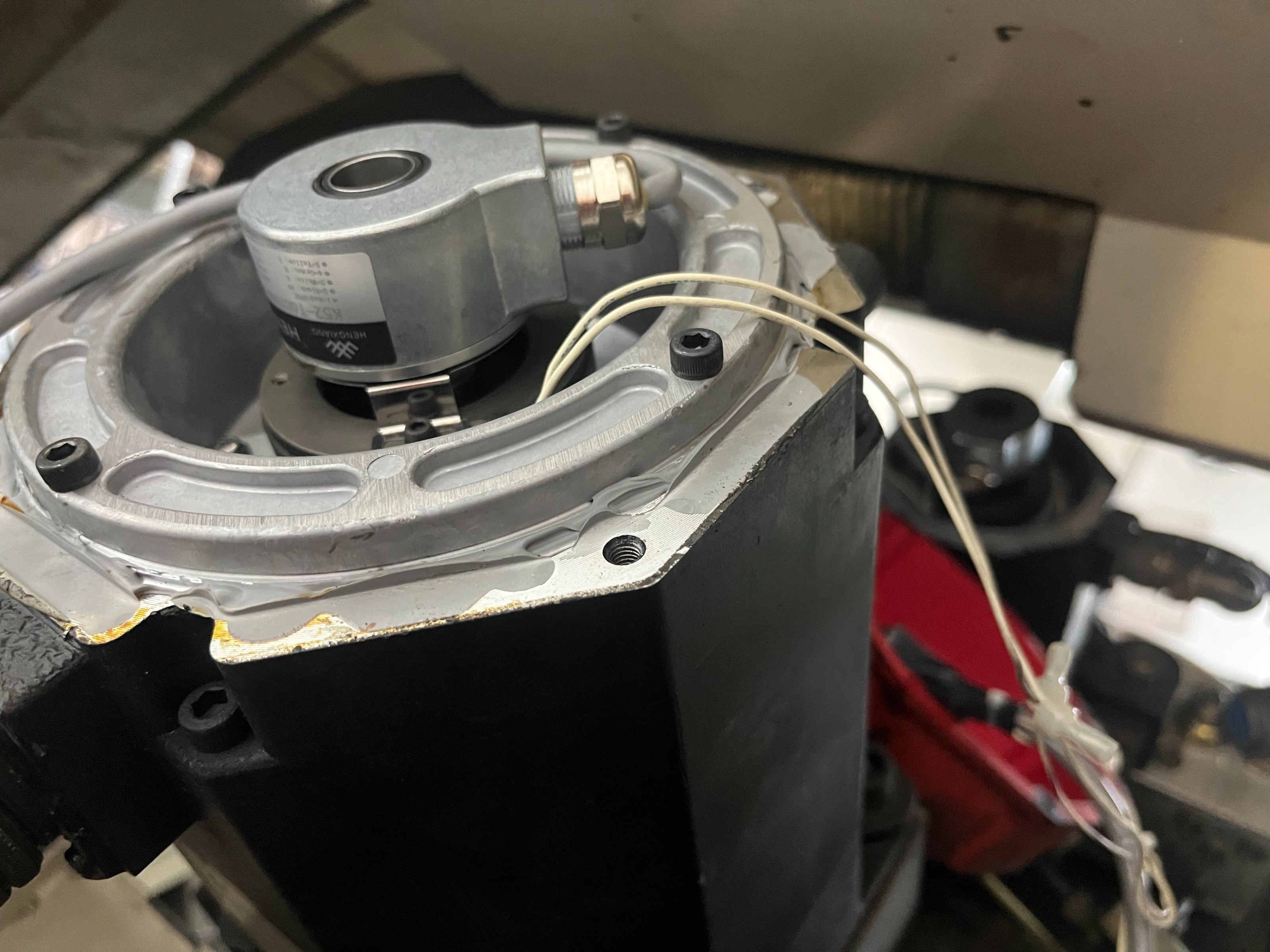Turns out that the new encoder mount flanges happen to line up with some holes on the old Fanuc encoder bearing housing, so I repurposed those to serve as the encoder mounts. All mounted on the machine now, everything fits under the original red caps, with one tight fit under the smaller turret motor.