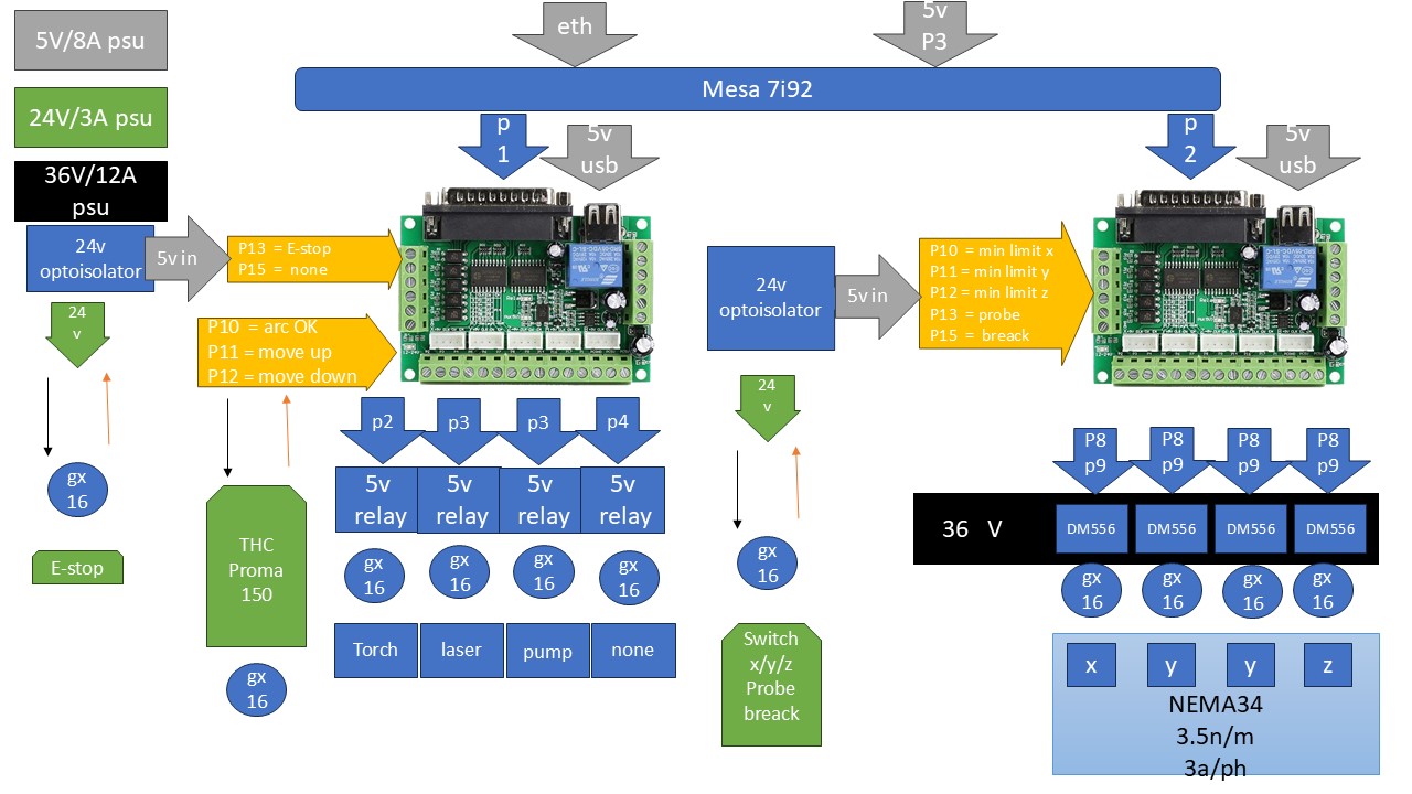 Also, since the 7i92 headers are mirrored (P1 and P2), both BOBs give access to the same type of GPIO pins. I’m hoping to take advantage of that symmetry and assign more pins for inputs (e.g., limit switches, ArcOK, ohmic probe, thc UP /down etc.), and just a few for outputs (torch on/off, float switch reset, laser etc.).