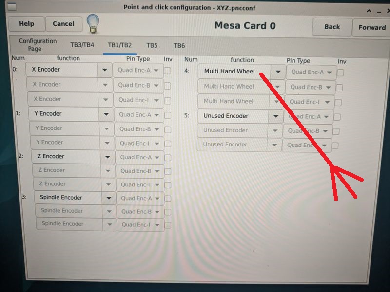 MPG wheel signal output are connected to ENCODER 4 (TB 2 / IN 9-13) and is configured in PNCONFG as MULTIHAND Wheel (foto)