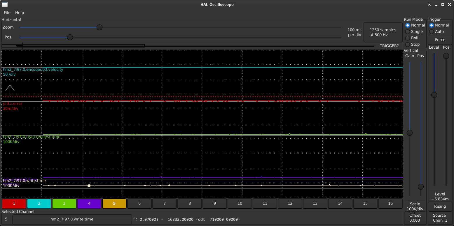 I tried to add [HMOT](CARD0).read-request servo-threadin the end of the servo-thread. That makes read.tmax drop significantly and realtime delay error does not appear but causes weird spiking in servo-thread.time when any of the axis(or spindle) is moving. The spikes also appear as joint following error. So maybe it's only hiding the problem from servo-thread?