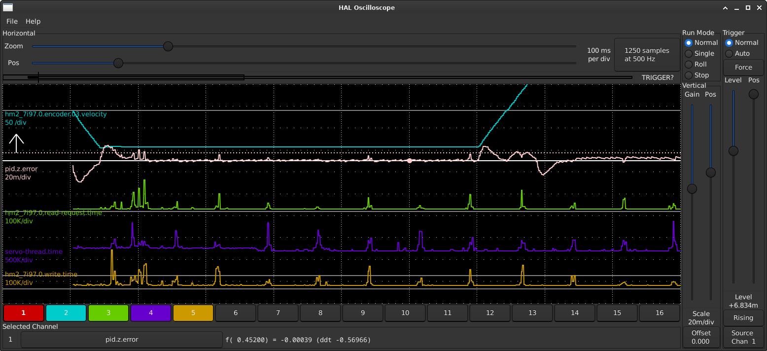 Halscope screenshots of spiking attached. These are captured having [HMOT](CARD0).read-request at the beginning and at the end of servo-thread. The following error spikes go crazy when read-request at the end but also visible when at the beginning. When servos are stationary no spiking.