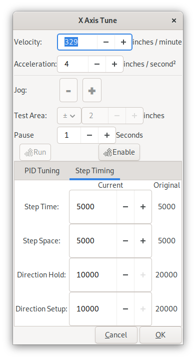 - Occasionally, when using 'run' on the 'Test/Tune Axis' panel, for a back and forth test of 2", the movement at the end of travel oscillates around the endpoints. It isn't consistent, it will oscillate for a little bit and then stop oscillating and then start up again. I will try and post a video of this shortly. Any insight would be greatly appreciated!