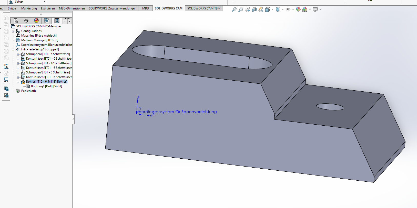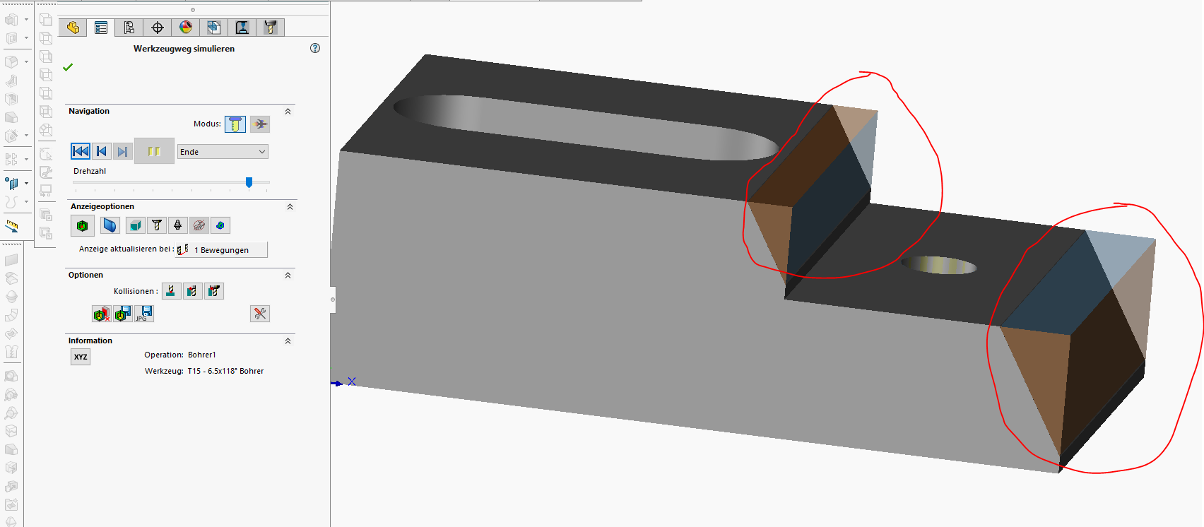 Attached is a picture of a part that I would like to mill. The other picture shows the part after tool simulation. Material remains on the bevel. How can I remove the remaining material for example with a 3 mm ball end mill? SolidCAM has the standard milling cutters, and I added a 3 mm ball end mill manually.