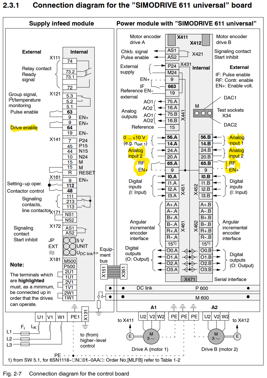 The Simodrive drives, even electrically, are not very clear in terms of connection, the drive enable connections (ENA0+, ENA0- GND, AOUT0). As we only have one analog input, we will try to connect GND and AOUT0.