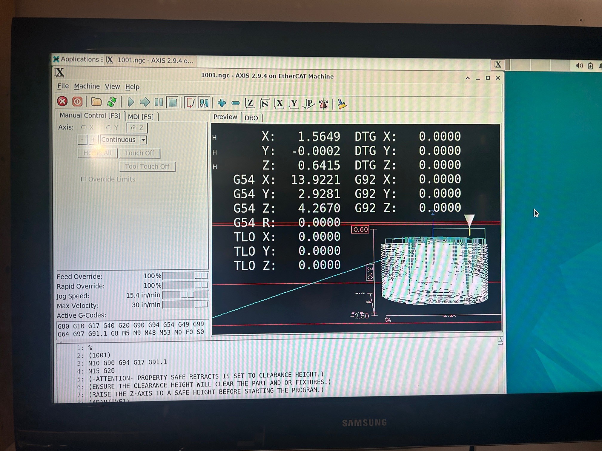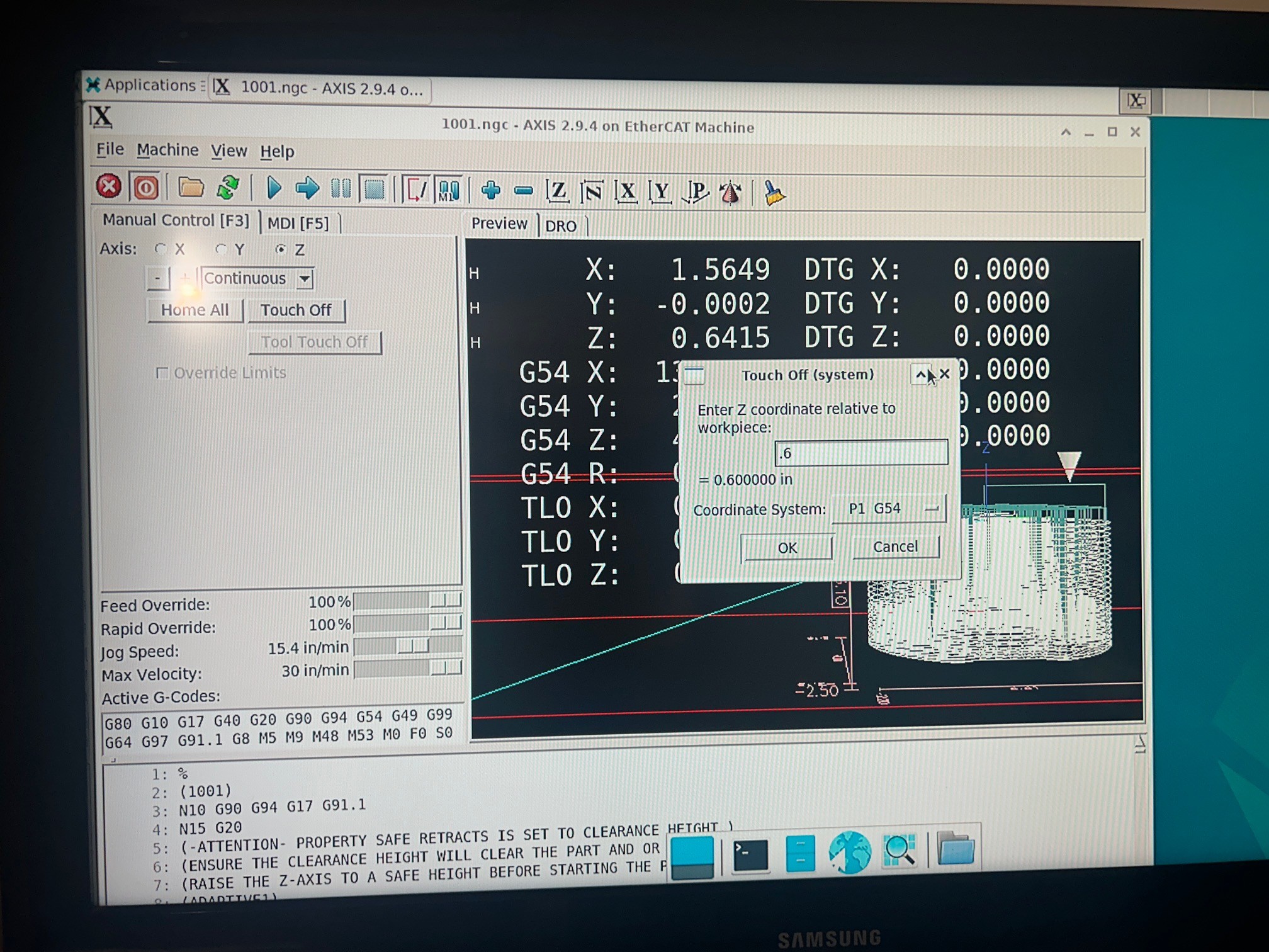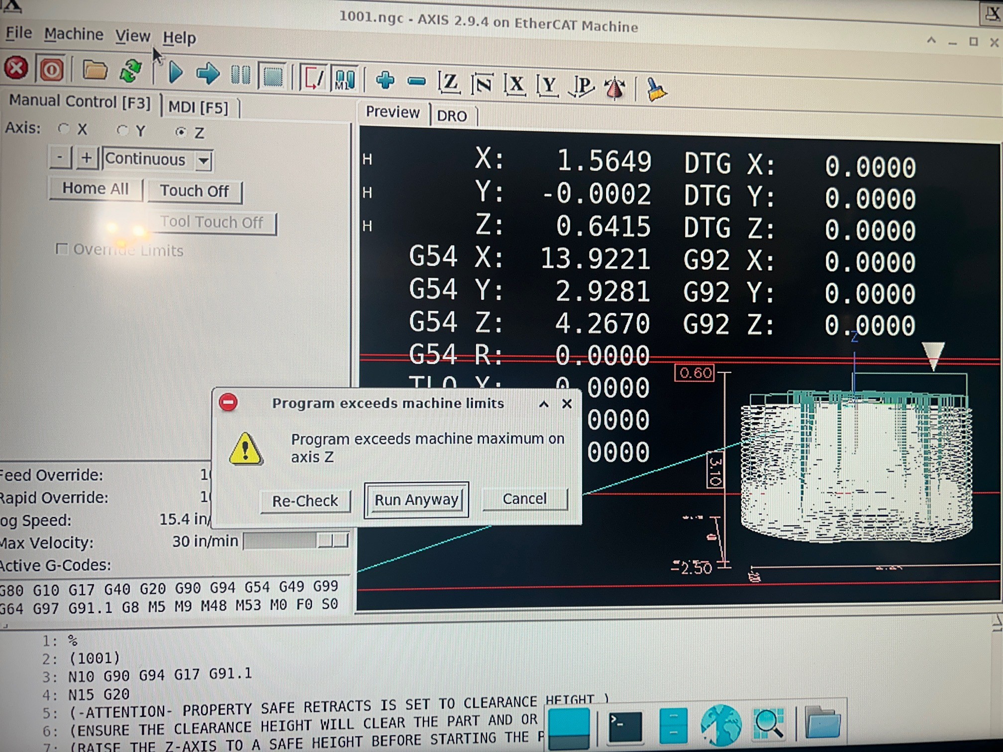 Fusion 360 says the max Z height is 0.6", so I moved my Z axis almost all the way up, then set the G54 Z position to 0.6". I did have the program run once, but then I stopped the program. When I go to re run the program I keep getting the same z axis error.