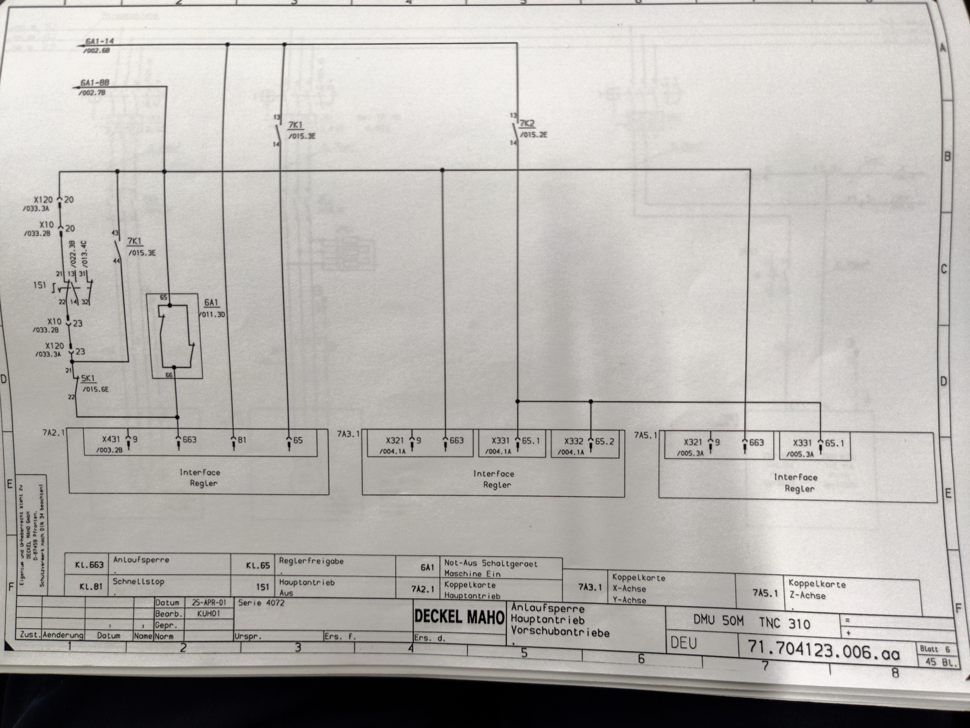 Yes, 7A5 is the Z Regler and 7K2 is its Freigabe relay, right? I believe 7K2 is energized only by the single output signal on X41 (attached page). The other 4 references to it show where its output goes. Regarding how I link that to LinuxCNC, I certainly am not linking the X331 signal to the Mesa directly. I don't see an obvious way to, nor do I think it initially went into the Heidenhain controller. From the looks of it, the signal on X41 that energizes 7K2 relay should be what handles the X331 Reglerfreigabe. It looks to be sequential, meaning X331 will be set after 7K2 closes. Am I understanding this backwards?