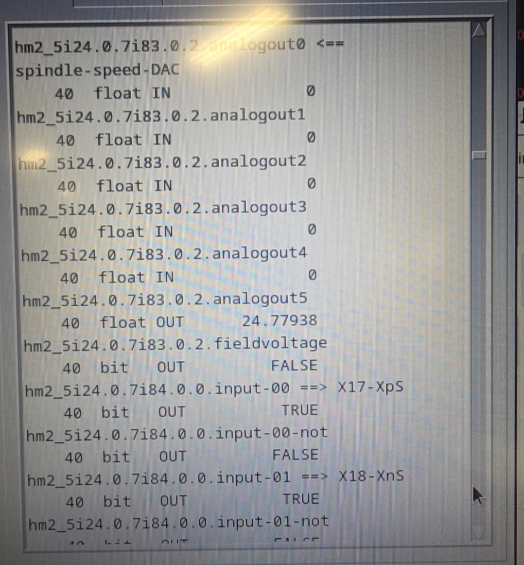 Sorry, I guess the images didn't upload. "hm2_5i24.0.7i83.0.2.analogout0 <= spindle-speed-DAC" reads in forward and reverse. In reverse it shows a reading of 8.25 and stays there, doesn't move when trying to adjust the speed.. In forward it stays around 2.69 with some variation in the next 5 digits. It moves up and down with speed adjustment.