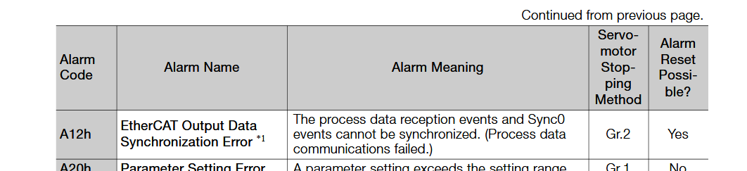 The problem is "Alarm A12 (EtherCAT Output Syncronization Error) "