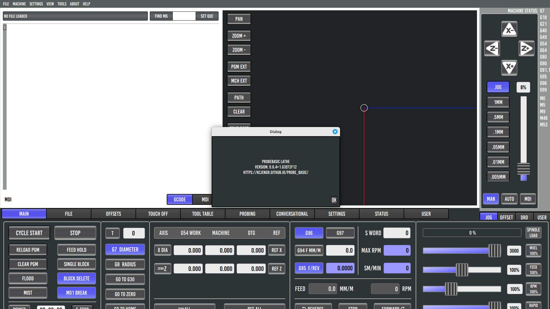 I’ve updated and replaced all the Probe Basic Lathe files and copied my configuration into the folder (HAL file, INI, and postgui). Everything is still the same. The bottom part of the screen is cut off (in PB Mill it displays correctly), the on-screen movement arrows don’t work unless I perform a home after referencing the machine, The conversational section doesn’t work, and the default RPM isn’t shown (for example, S500 in the INI file). It’s the same in simulation mode.