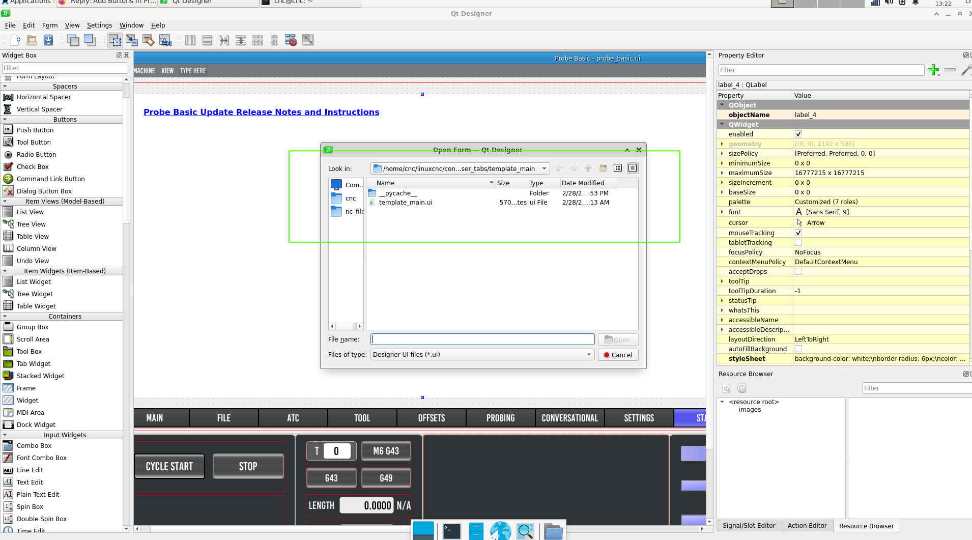 this goes for when you edit anything including the user sidebar, the user tabs, user buttons etc. this opens probe basic in qtdesigner and qtpyvcp so all of the existing custom widgets are available.