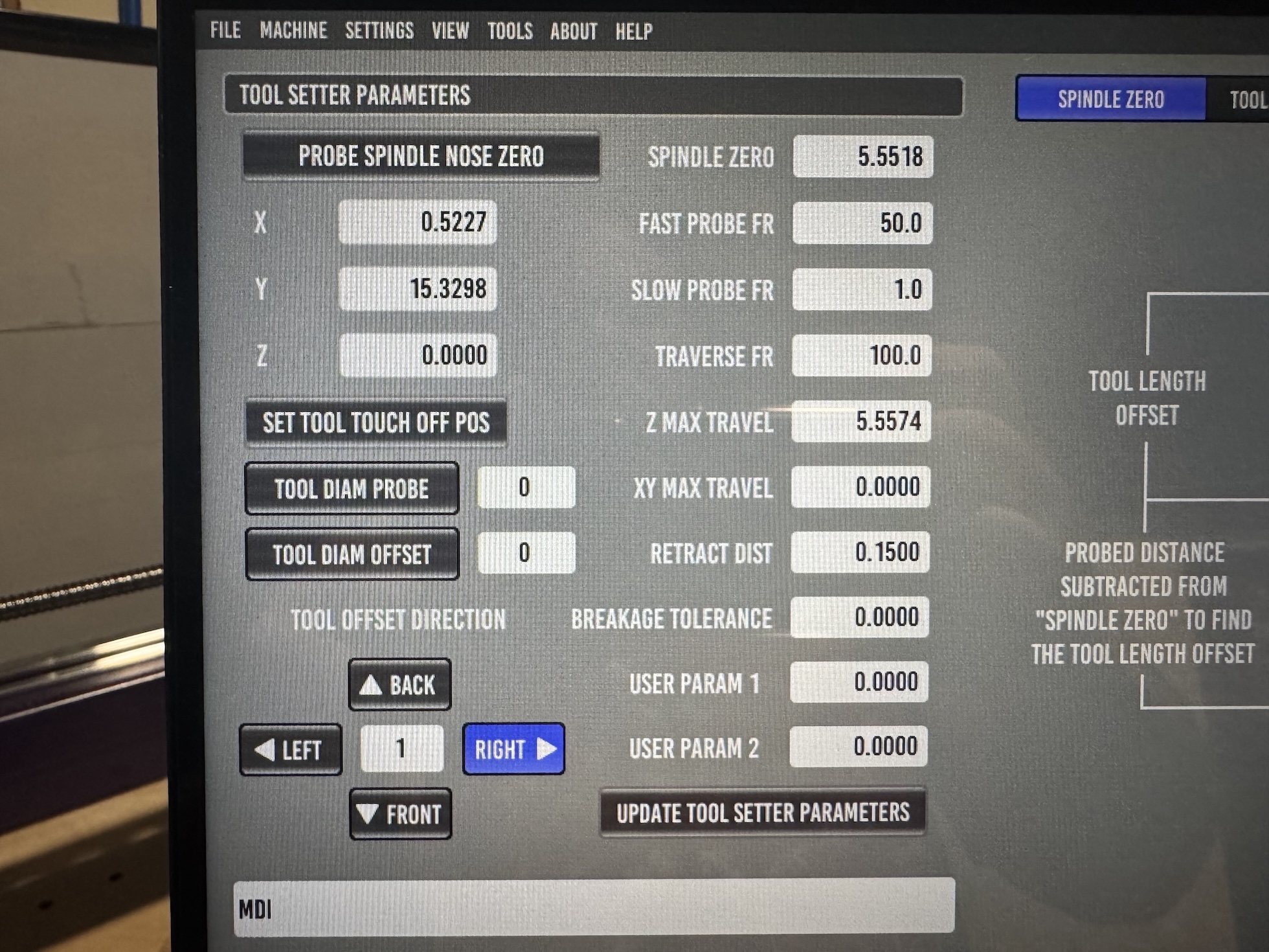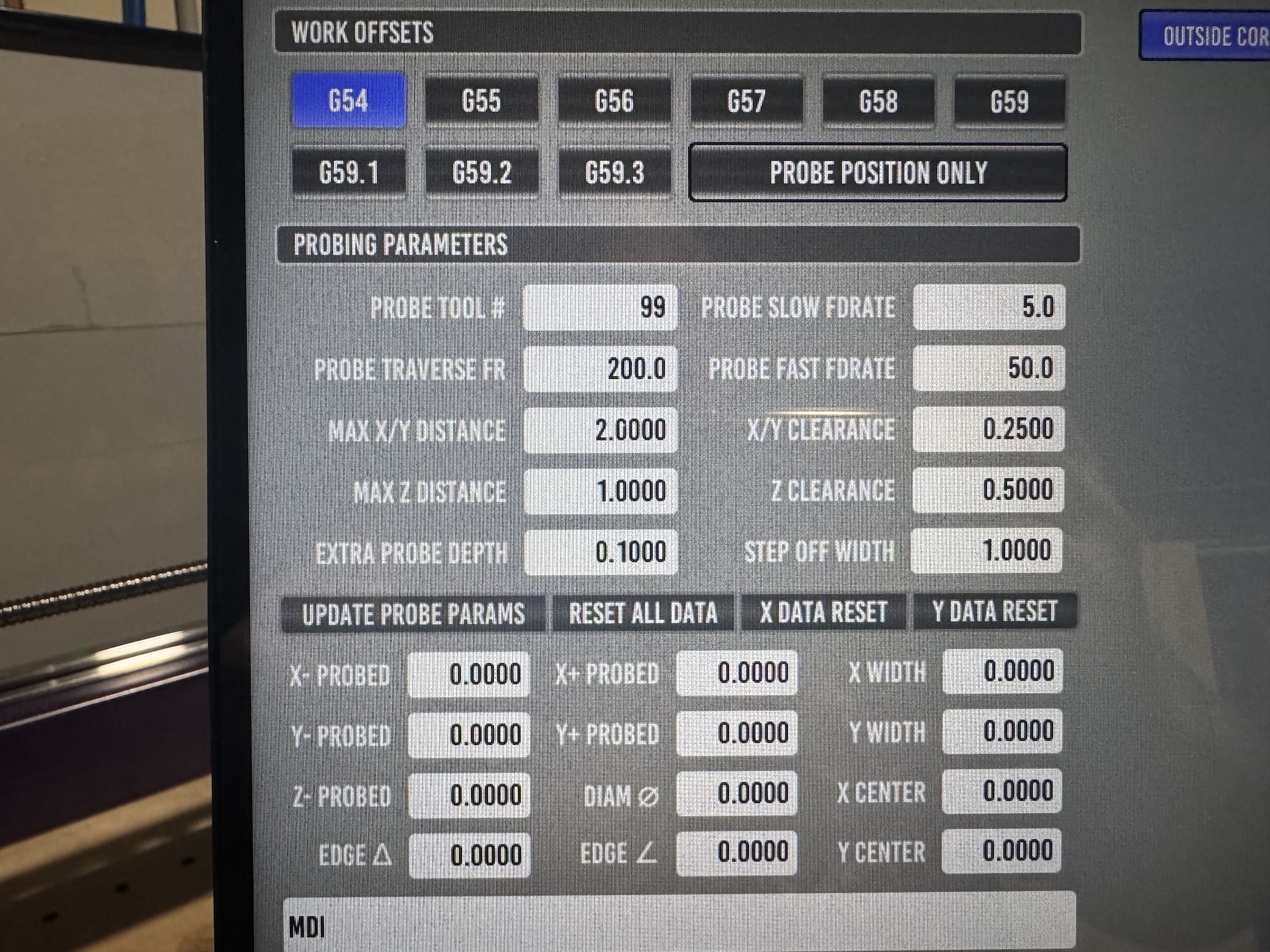 My machine overall is a router style setup with a 30 in x 30 in work area. My spoil board is ~24 in x24 in. The spoil board corner is not at (0,0), well inside the machine soft limits. My tool table only has Z offset and Diameter. After probing the corner of the spoil board, the G54 offsets were: X=5.0161, Y=1.1693, and Z=-7.4953. Z probe Z offset is 2.3607 and cutting tool Z offset was 1.8513.what is your machine setup like regarding tool offsets?
