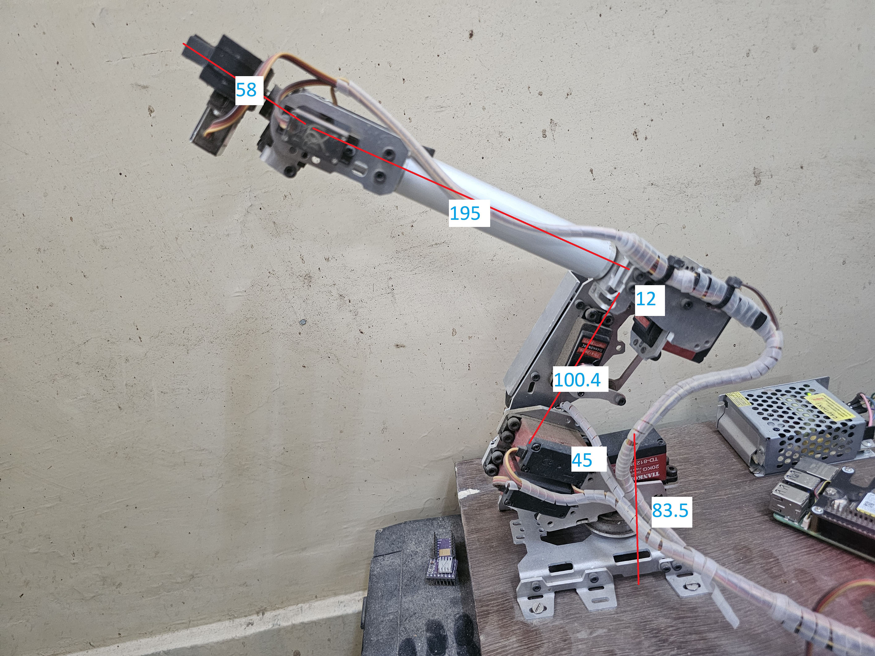 I have configured and installed LinuxCNC on RPI5 and I can control individual joint of robotic arm using trivkins. Using PCA9685 as PWM servo controller. Its work good. But I am strugling to get its kinamatic working. Here is photo of my arm with measurements.