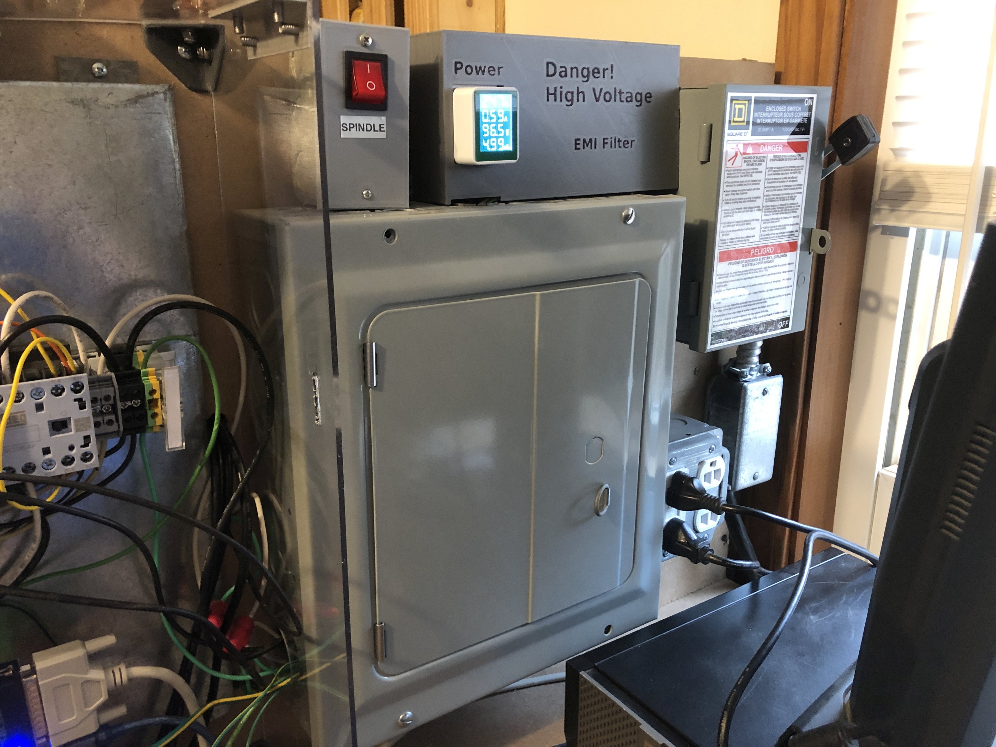 This is what happens when I try to run a program: I home the machine, import the program into Axis, hit run, and it could be 1, 5, or 60 seconds later that it suddenly stops the machine because a limit switch was supposedly hit. It doesn't seem to happen consistently. I originally had the VFD next to the other electronics in a copper mesh cage, but ended up making a sheet metal box for it and moving it away (and took the spindle cable out of the cable chain that also held other wires). I thought that would prevent any EMI from interfering with the other electronics. But that didn't fix it. I have narrowed it down to an issue between the spindle/VFD and the breakout board. I can run a program perfectly fine with everything on except for the spindle/VFD, so it can't be the steppers or drivers. I have tried running 24v directly to the optocoupler board, bypassing the switches, but it still triggers. I have tried completely bypassing the limit switch circuit by jumping the input pin on the breakout board to ground, and it still triggers. I have spent hours researching this, and I have tried almost everything. I have my VFD in a Faraday cage. I'm using a shielded spindle cable with the shielding grounded at both ends. I have the signal wires shielded and grounded. I don't know what I'm doing wrong.