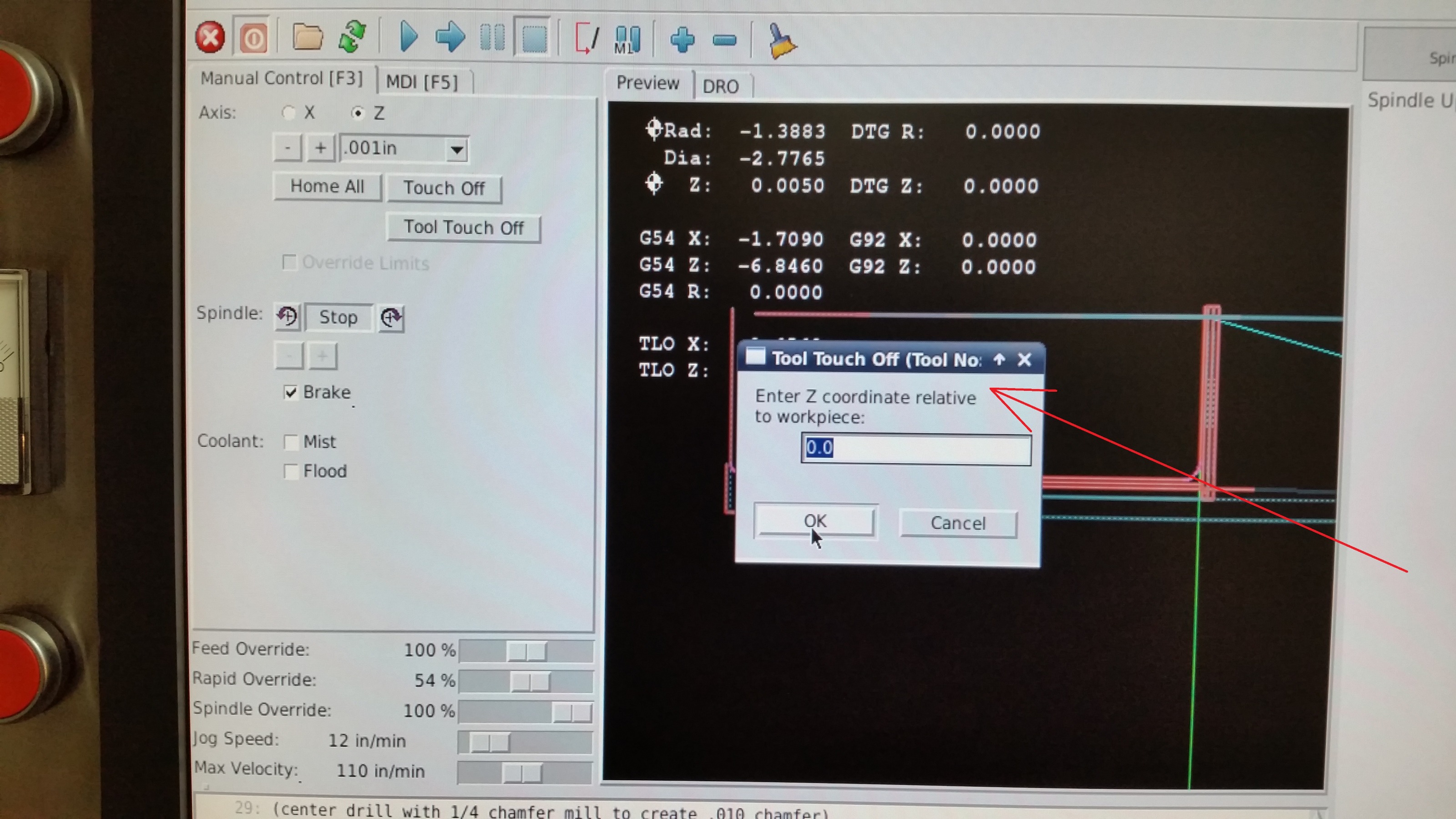 The current tool number is visible at the very bottom of the Axis window, along with the offset in effect.