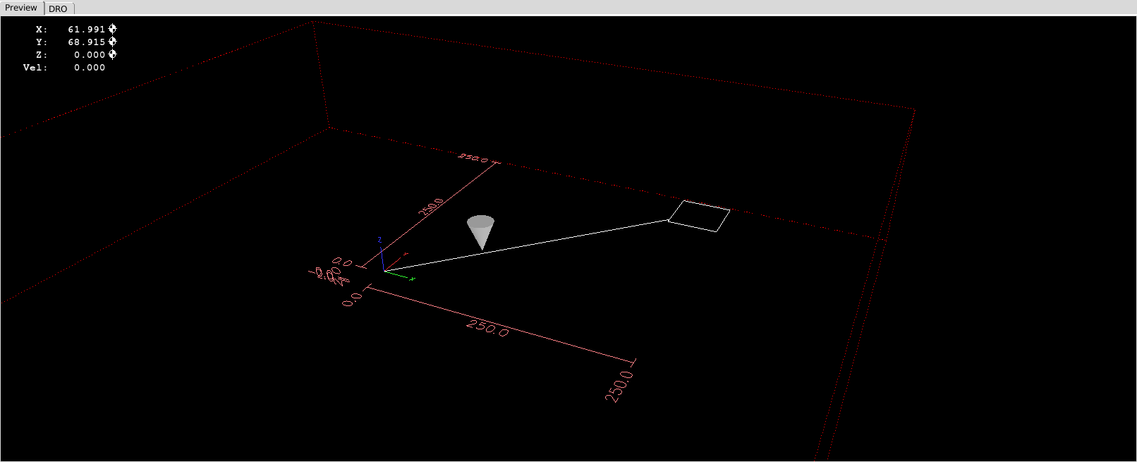 I am facing a display issue under Axis on the preview when loading a Gcode file. Usually Gcode files will start with a first move as a G0, but I 'd rather use a G1 for the first move to be able to control the feed rate of this first move. Unfortunatly, this seems to induce a weird computation on the extents of the geometry of the file and a move is displayed from the 0 location of the machine.