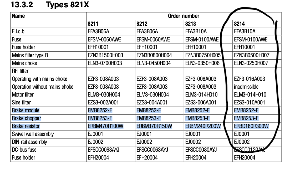 → 8221 and higher (37 kW+) → NO built-in chopper → you need external brake unit (8250 or 9350 series)