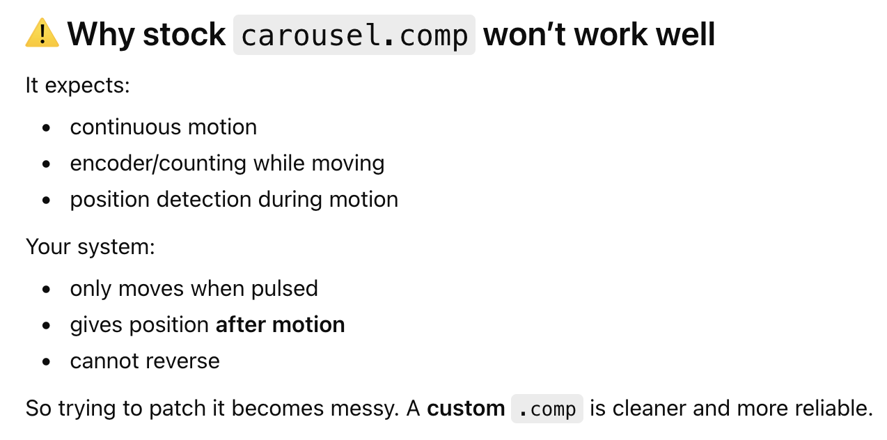 I was trying to work out how to address not having any feedback on the turret arriving in position. Because I am a shit programmer, I tried Chat GPT yesterday.