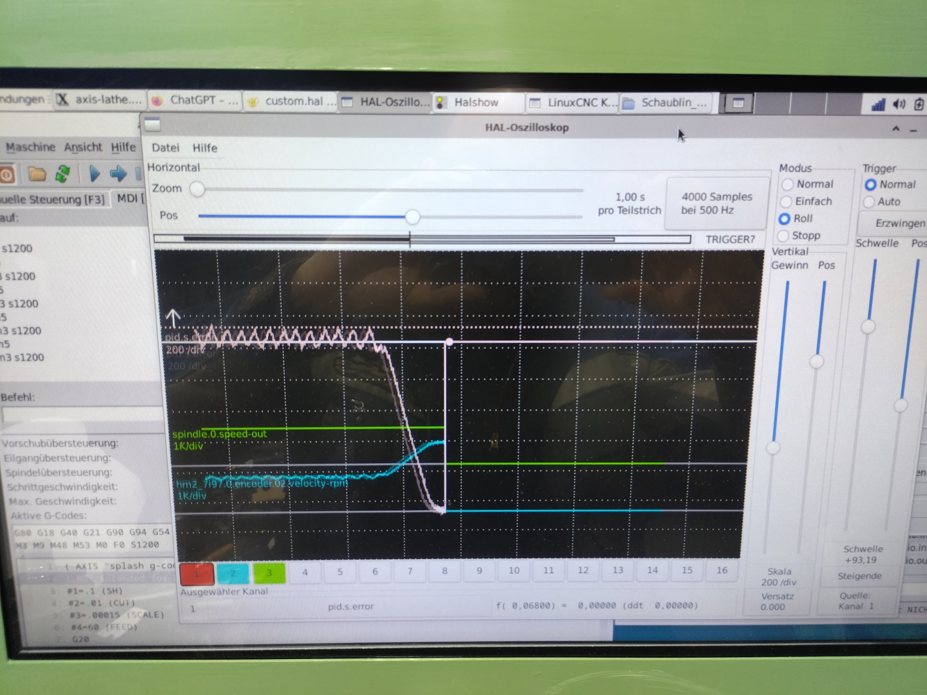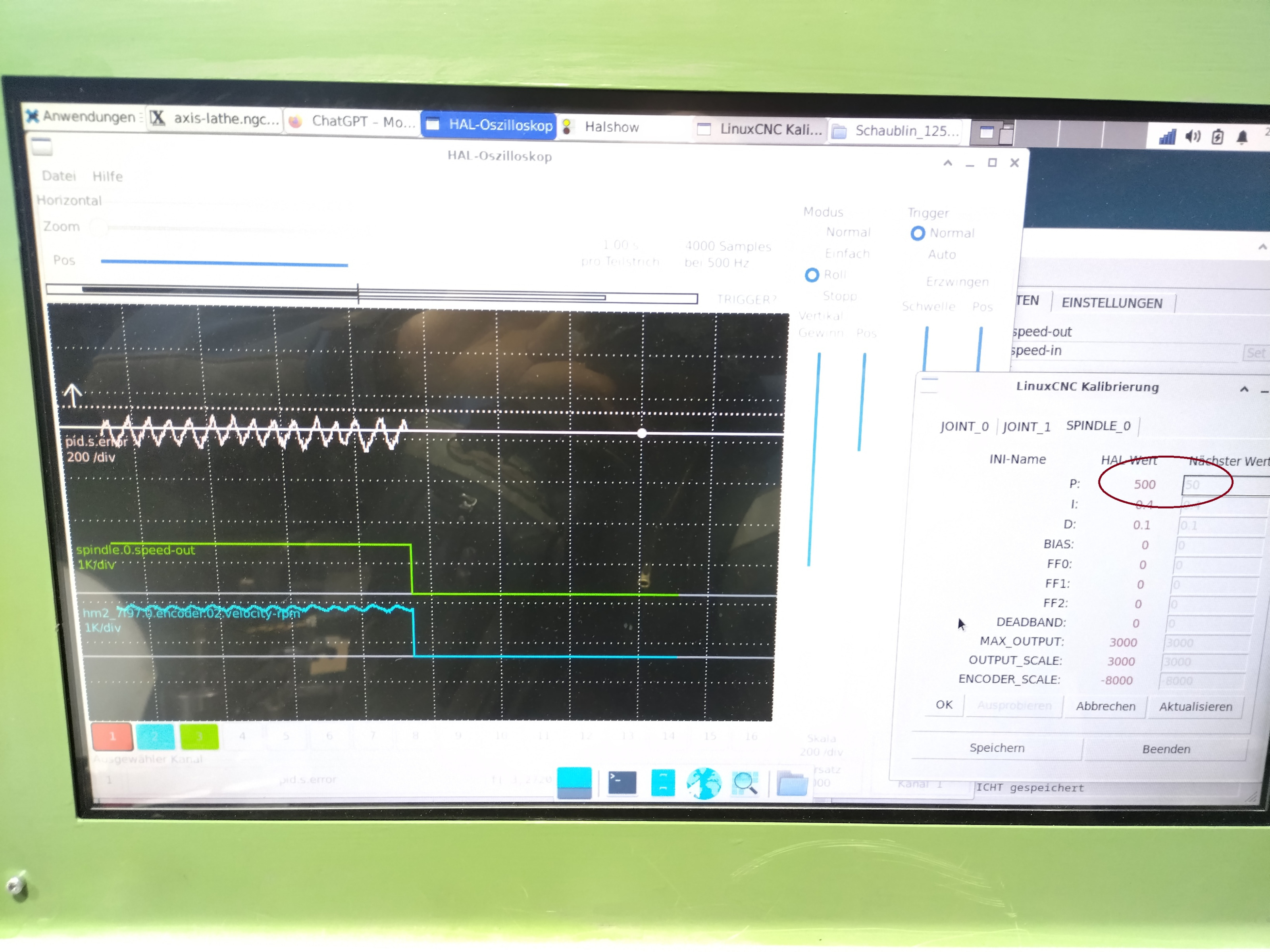 My plan is to tune the PID at this point and later multiply the error term (pid.s.error) by the overall reduction ratio. If I am not thinking about this totally wrong, this should give the system a hopefully somewhat stable spindle PID over the very large reduction that the backgear and variator provide.