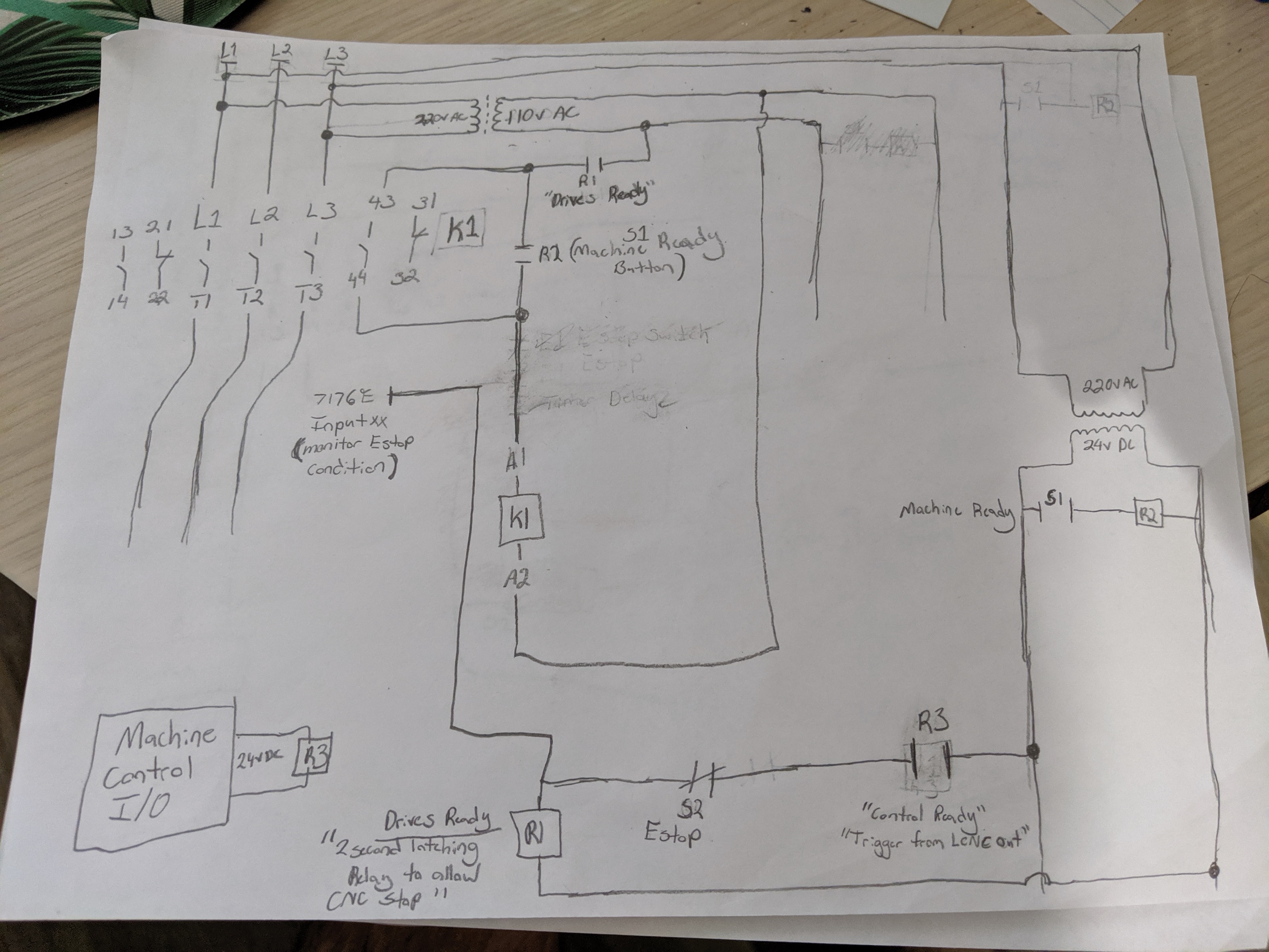 I'm going to add the latching delayed relay FOR R1 for 1-2 seconds to allow the control the opportunity to give stop command before cutting the power. Which will be triggered by LCNC monitoring the signal at R1. Comanding a stop when the signal drops while R1 holds latched for 2 seconds before breaking K1s power.