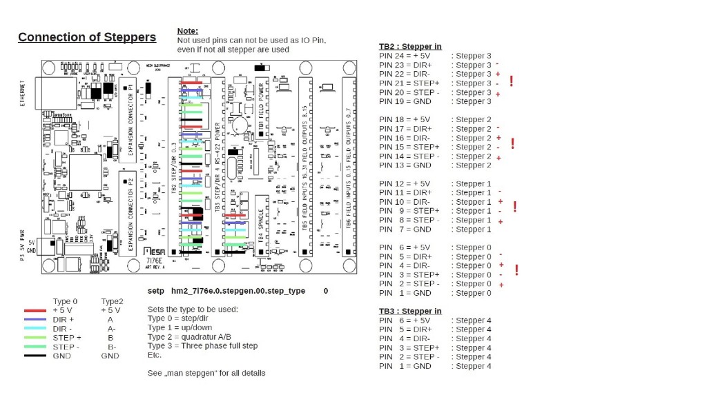 Im using iHSV57-30-18-36 and Mesa7i76e .Now I have the problem that stepper port 3 outputs only 1.6v. In addition, Dir +/- and Step +/- are reversed in all stepper connections 0-4. If I plug it on plan I have a negative -4.4v at the rate that's why I connected on the minus. Without connector on the stepper connections I measure 4.9v with plug / cable 4.4v at port 0 + 2 +4 respectively. For stepper connection 1 3.8v and for stepper connection 3 only 1.6v. Everything measured at the exit you (see pictures link). Step +/- is the same everywhere with 4.4v I do not use the 5v input but 24v. Also, all jumper default except for the ip. Is this a defect or am I doing something wrong here? Measurement Mesacard picture link .