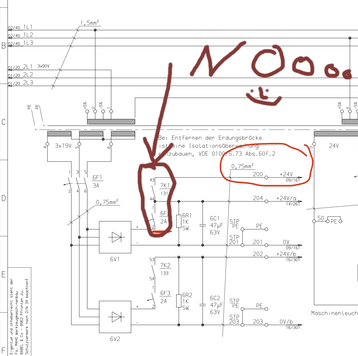 Right now, the 7k1-131 relay contact is disconnecting the 24VDC supply to mesa 7i84 board which is no, no as indicated by Tommylight. I can suggest you jumper 7k1=131 contact and replace the single pole relay 7k1-131 with a 3-pole relay to disconnect the 3 phase AC side of 6V1 power rectifier. let me know, if this info does not make sense, I can draw a diagiagram.