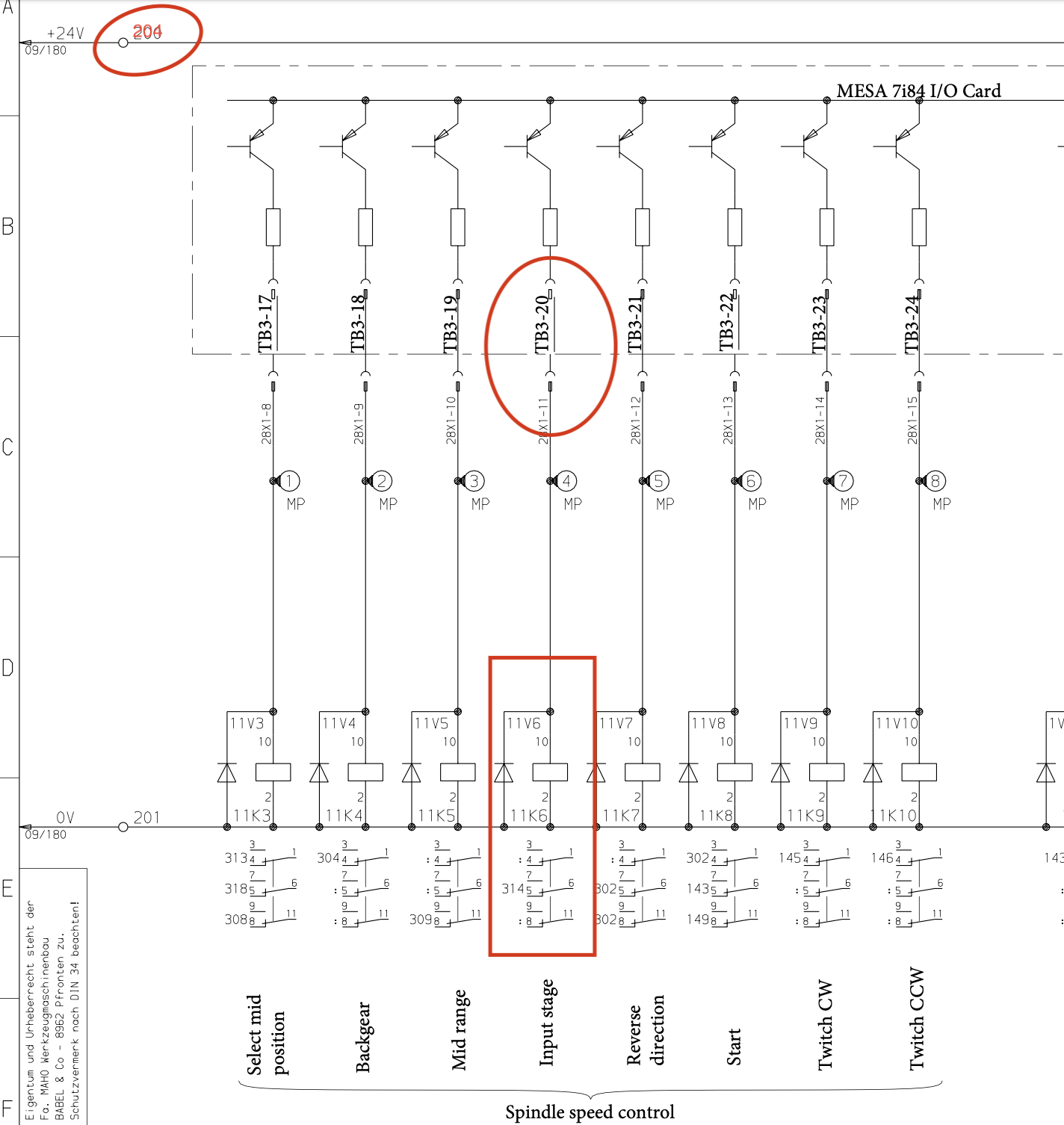 Hey, since I'm retrofitting my MH400e right now I'm "glad" that this problem was found. I thought about how I will resolve this. Since I want to keep my maho as original as possible, I'm thinking about ether a switch bord between the outputs of the mesa card and the relay board or to just lock it out in the software and to add a new 24v dc power supply. Any thoughts about this?