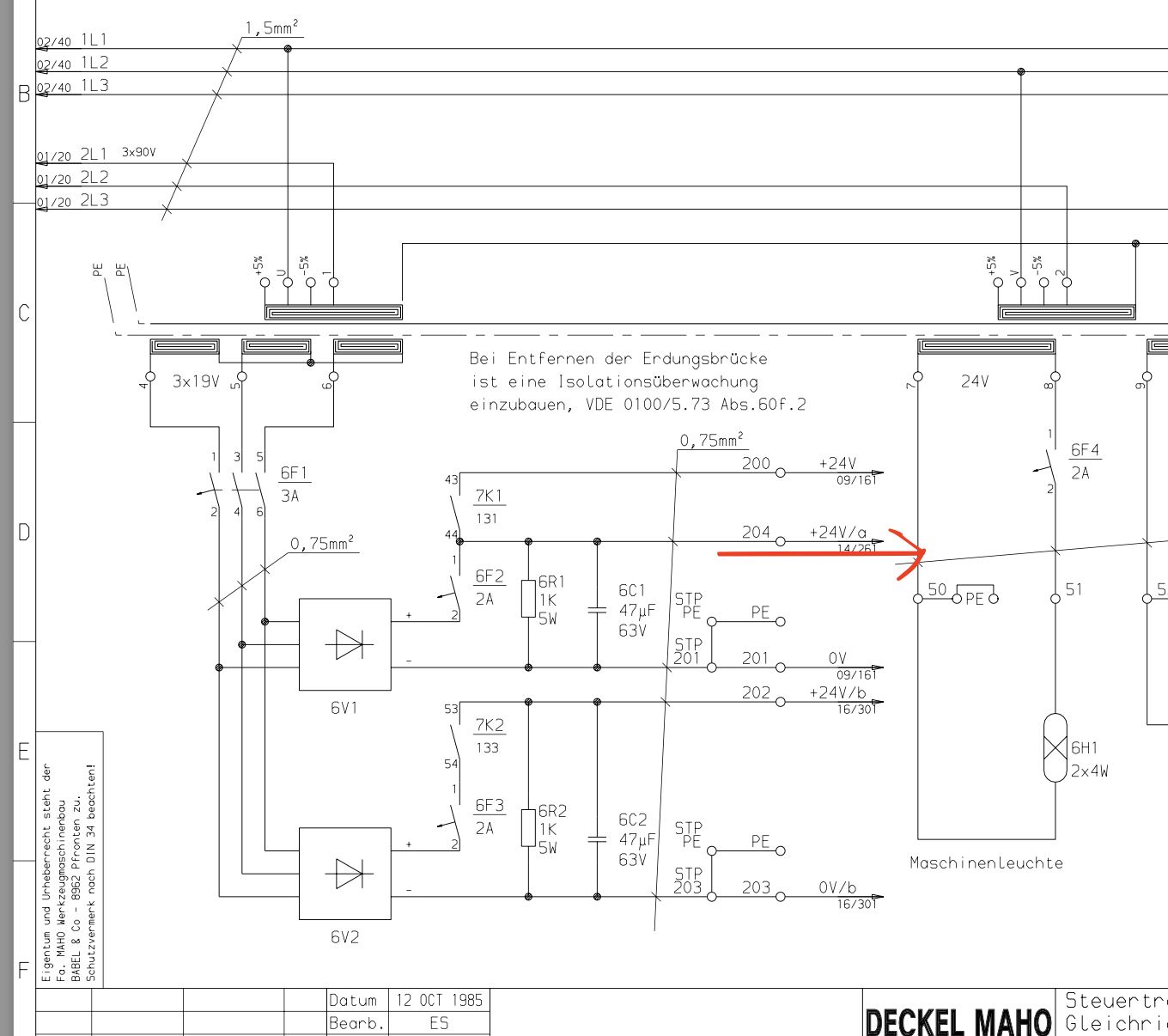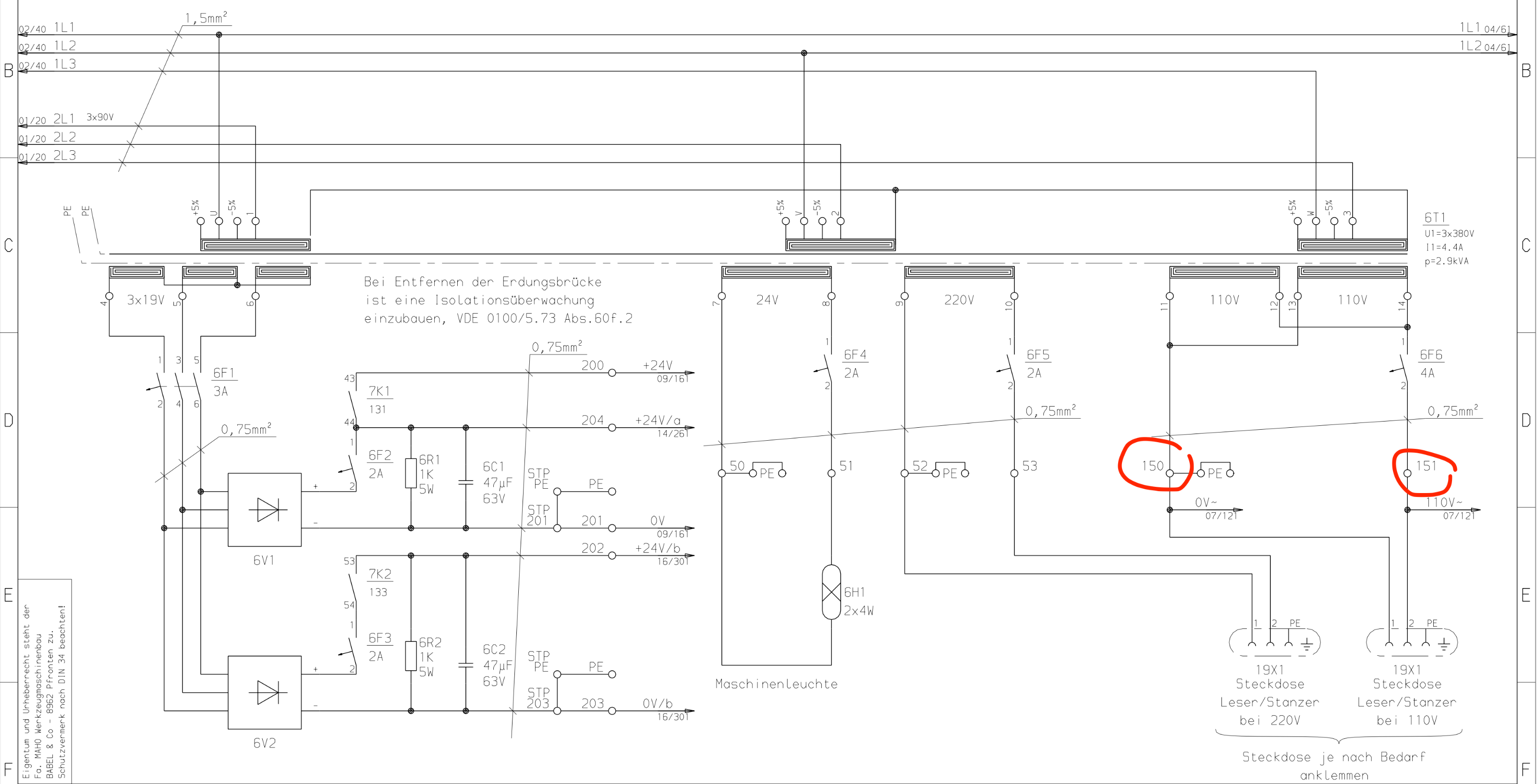 Today, I wanted to repeat that, but the PC gets no power. I receives 110VAC via pins 150 /151 from the same 3Ph transformer (6T1) which also powers the 24V DC rails. The 110VAC secondary is protected by fuse 6F6 , which has not tripped.
