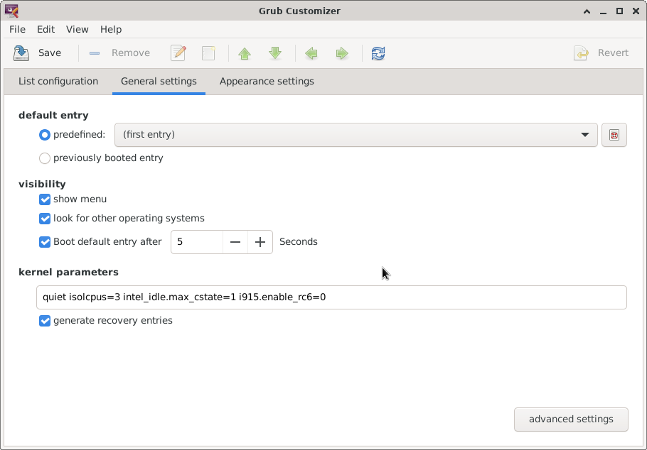 This is my current boot parameters with grub.Edit: I put linuxcnc on miniatx motherboard with intel i5 4460 and realtek RTL8168 ethernet.