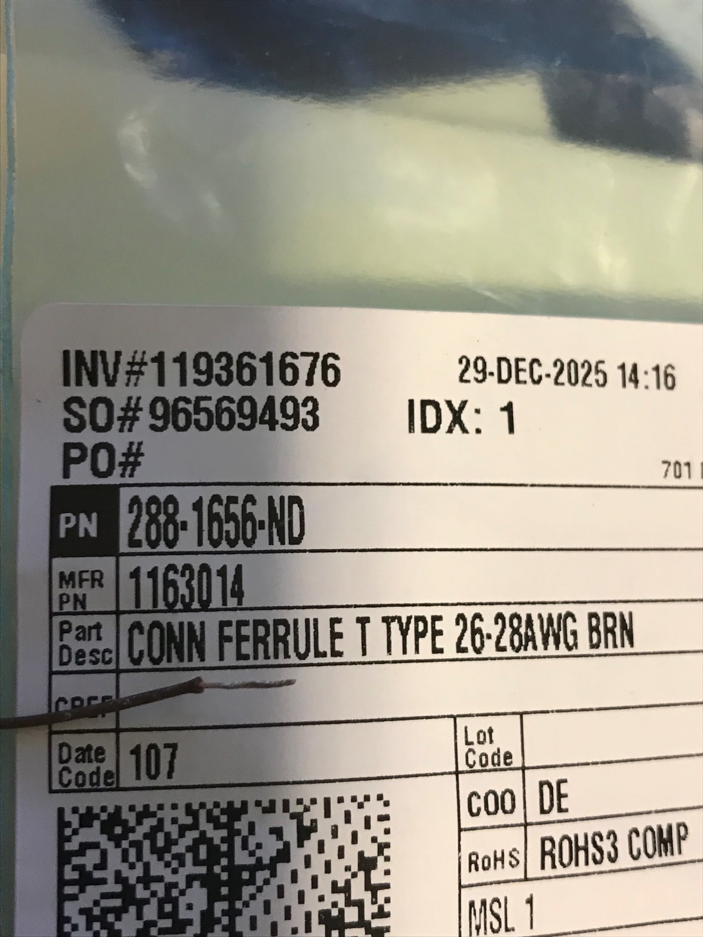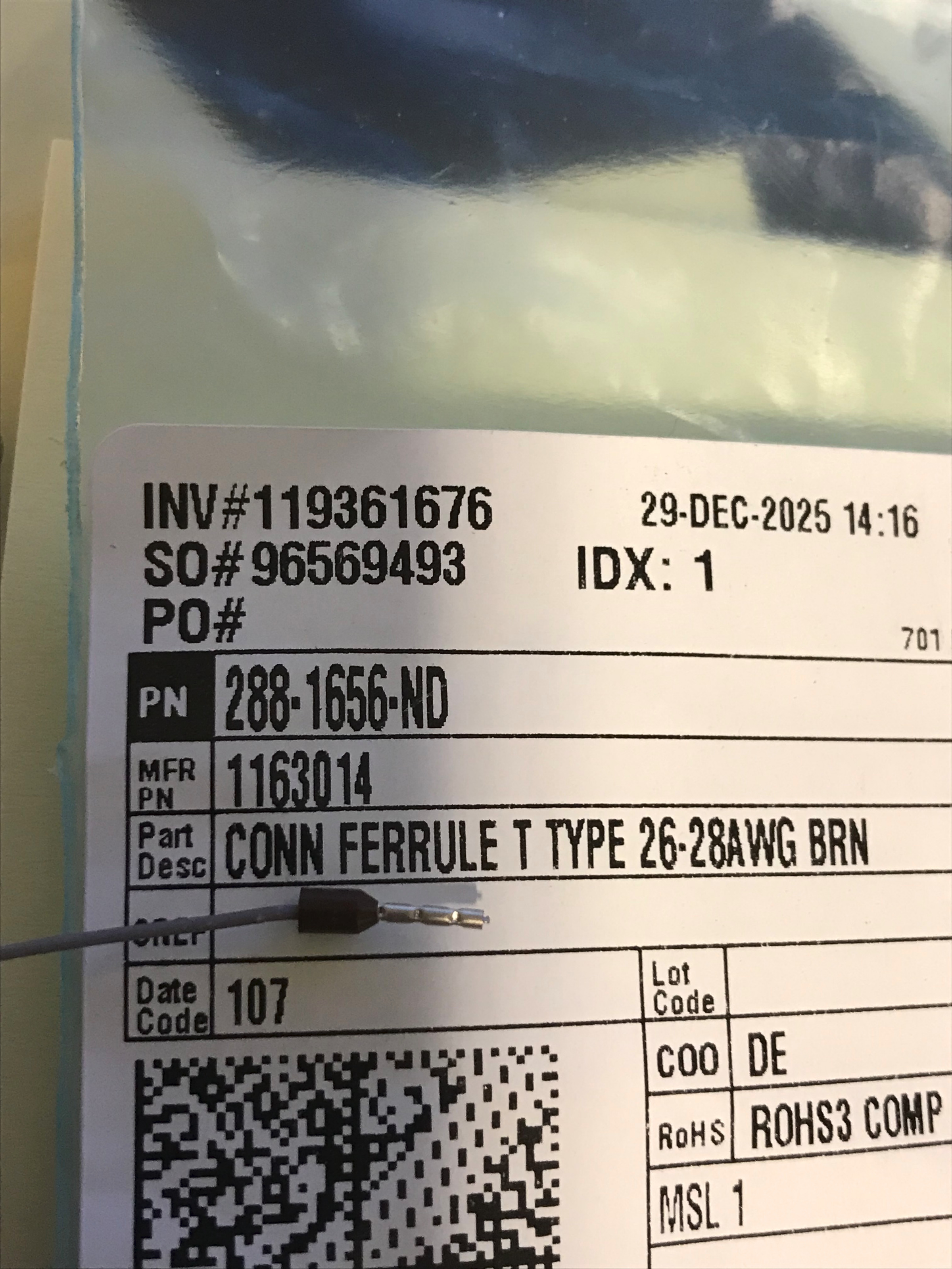 I purchased two different ferrules but the one that seems to work best is a 0.14mm2 - 26-28g brown Digikey PN 288-1656-ND, manu-PN 1163014