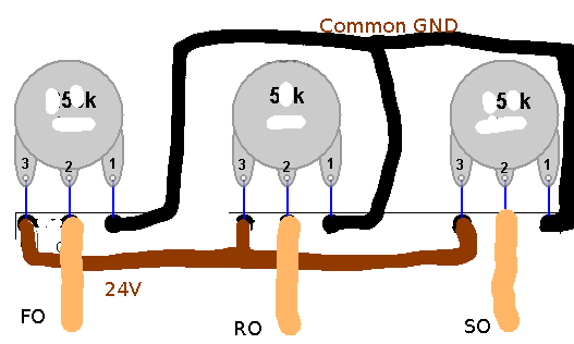 The GND is the same ground I'm using in the entire machine. This connection point is shared with the 12v power-supply, and the 24v source is the same that is powering my panel buttons and connects to my field power. The overrides(pot pin 2) are going to the 0,1,2 pins of the 7i77. Should I run another ground wire (star config) back to the grounding plane? Or did I have bad pot to begin with?