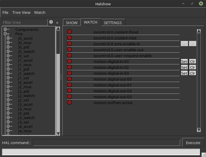 For outputs, 2.10 (or Master) has a nice feature where you can toggle inputs and outputs from the "show hal configuration" menu, so add the Mesa outputs by assigning some random names to pins, then use the above to toggle on and off outputs by clicking on SET or clear, as shown bellow: