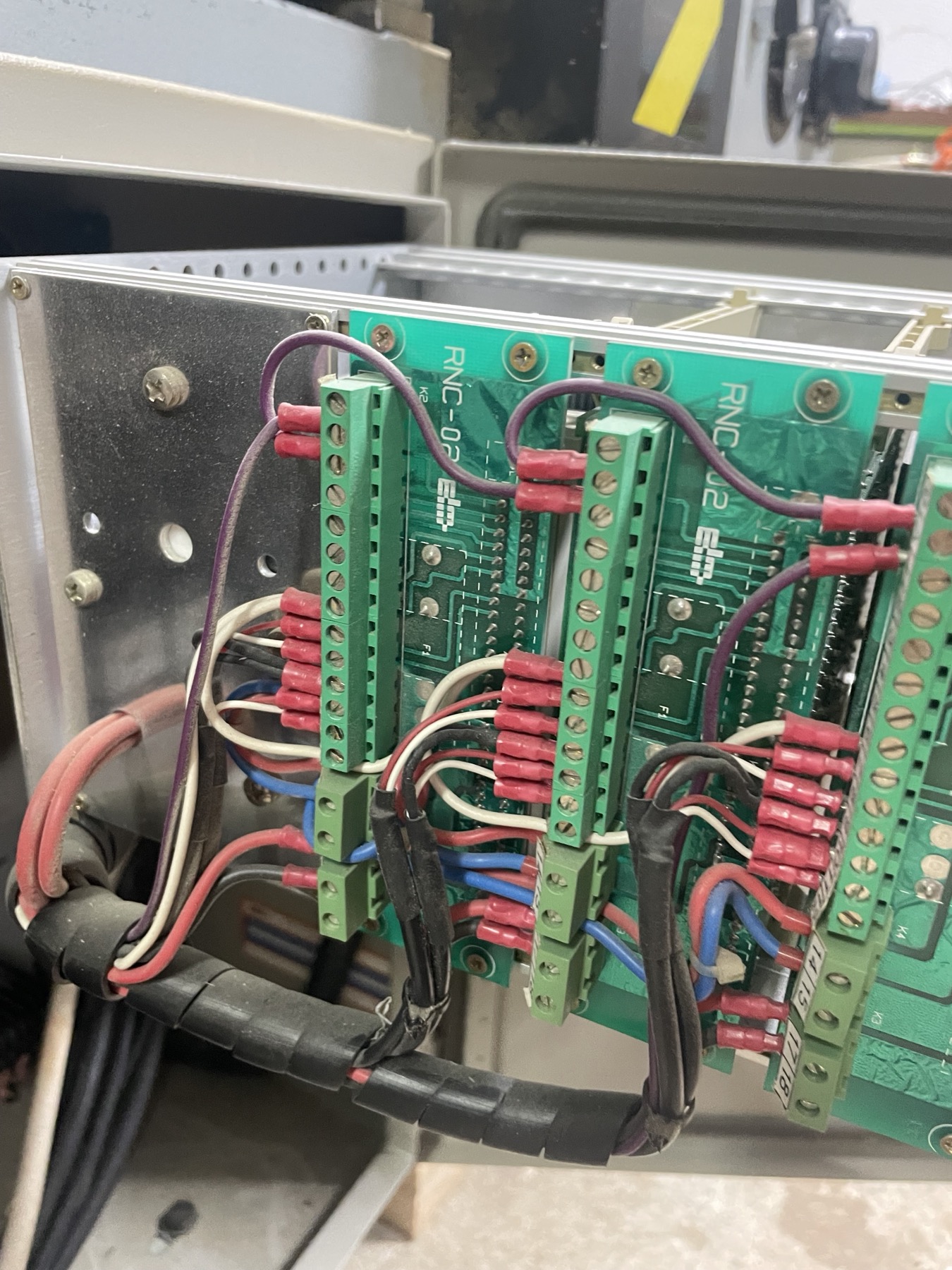 thank you very much for the answer, it will certainly help me later, now i have come to the conclusion that I could destroy the drivers by bringing 24v for enabling, it did not occur to me that the old controller gives 10v on that output, otherwise they are all 24vdc. and now here in the picture you can see these white wires, they are connected to enable on pin 7, however, the pin 6 from the driver just gives 10v and then I managed to short-circuit to pin 7 and the drivers are enabled, however, I still need to understand the estop chain so that the switch that supplies power to the drivers would stick, when I turn it on manually, the axes slide slightly to one side, maybe mm/min, I assume that the offset on the trimmer is not well adjusted, But, when all that I did it via the Mesa 7i77 card, i installed enable and brought the wires for the analog signal of the axis, when i start linuxcnc machine F2 axis move a little and stop(joint following error) (I will have to try to tune the motors first or maybe I should try to turn the analog wires ref and ref-?