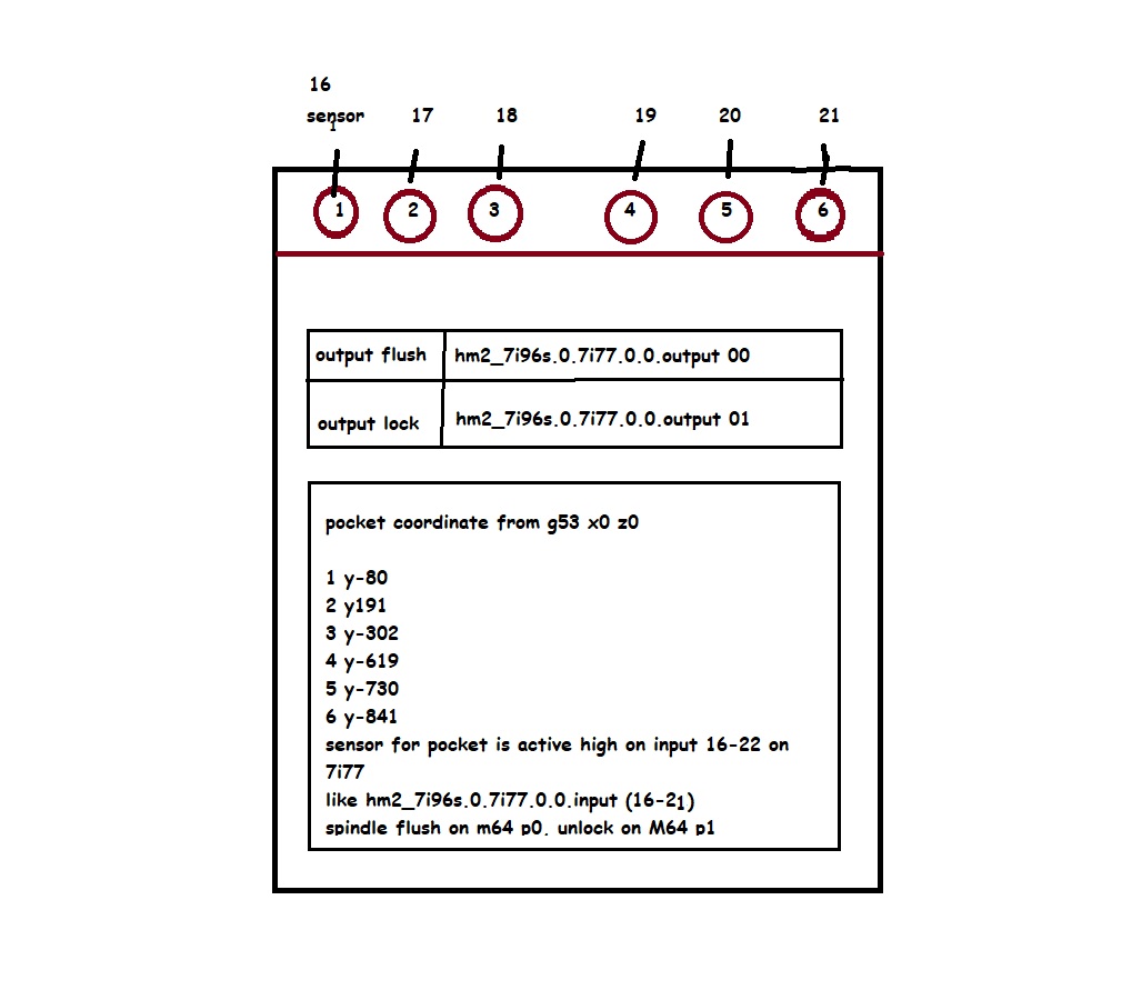 I installed the homing, the remap for racktoolchange based on the example does not work for me, it throws out some errors, if there is someone more expert, I will send the files and errors so that he can establish it, the change system is very simple, I have 6 pockets, two outputs that I connected to the hal and which work in mdi, one for tightening and releasing the tool, the other for locking... I have on each pocket an input for the inductive sensor that the tool is in the pocket, I have positions where x0 and six of the y position of the tool and the change is works on z-120mm from G53. thanks in advance