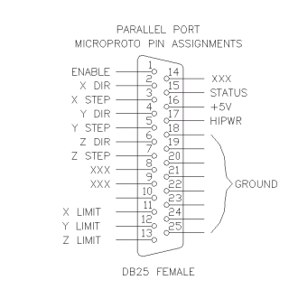 For bring up I got the LinuxCNC live disk image and installed that on the system. I ran the latency tests and got numbers that were generally below 3000 (for the top number, I don't remember the bottom one at the moment). I used the Stepconf Wizard to convert the MicroProto supplied Mach3 profile to LinuxCNC. When I ran the Axis program and tried jogging, or the Stepconf "Test Axis" function, I got no response beyond a faint "klunk" the first time I pressed any button. The steppers didn't seem to be locked in place, I could turn them by hand with no noticeable resistance. I poked at that for an hour or so, then decided to see if the system worked with Mach3.