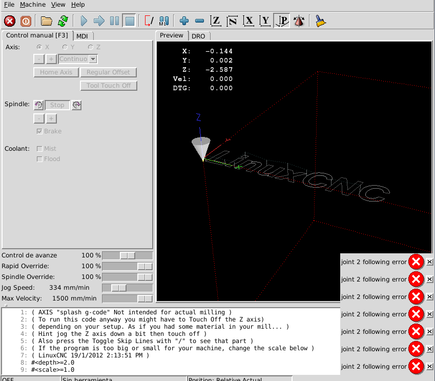 Thank you is done, now it is another problem, when I make my configs with pncconf I think everything is fine but when I turn on the machine it sends a signal, Z axis moves and it appears following error: joint 2 following error, in 0 (X) in 1 (Y ) And 2 (Z), comparing several HAL files. Of other people to me it comes out different (I hope to upload the images because I do not know how) well part of the axes (X) (Y) (Z) I have there are a couple different things I hope they can help. And thank you for your help, the different parts are as follows: