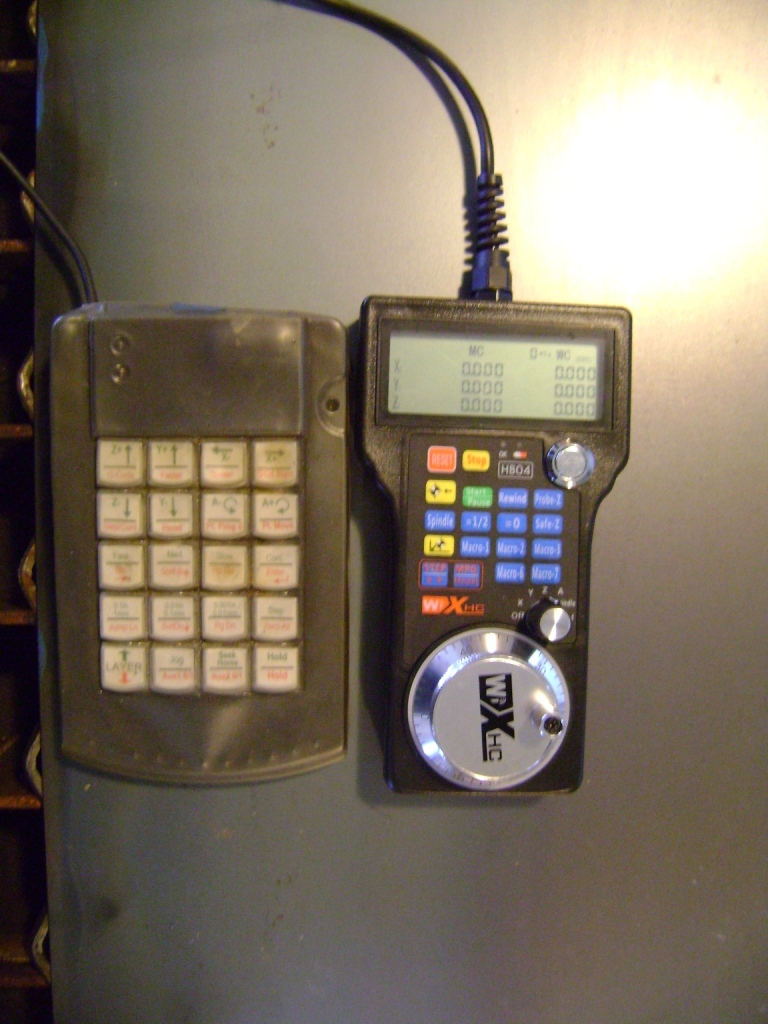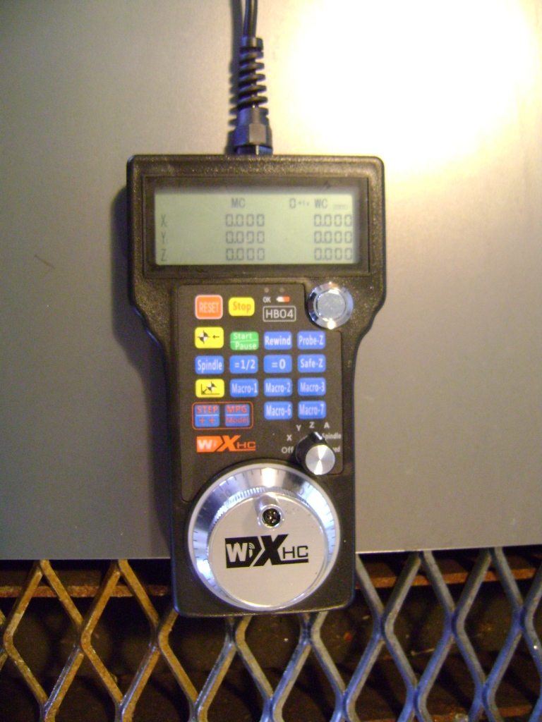 I took the unit out to the shop as soon as I had some time. Reading through the XHB04 man pages and sims I was pretty sure that I had a good chance of making it work. I plugged the unit into on of my front panel USB ports and pressed the toggle on button and the LCD came on and the activity LED flashed when ever I pressed a button or moved the jog wheel. Well I thought this is good, at least I don't have to fight with an EBay vendor over a DOA unit. Following the instructions in the sim directory I fired up the test program and everything worked just as it should! Further reading of the man pages and of the sim directory readme file lead to me creating a new configuration to try out the pendant. I made the changes to my .ini file that are called for in the readme and tried to start linuxcnc... as expected a string of errors posted to the terminal. Nothing serious, all related to not finding files, moved the layout file to my config directory and now new errors. Again as expected new errors, now the HAL is complaining. This is hardly surprising because of all the funny stuff I have going on between using external offsets and the general plasma THC stuff. The problem was where I had already used some pins that the component wanted to use. A little minor editing of the .tcl file so it used my previously defined signals and all is good. And I am using Master 2.8 Pre1 with external offsets!