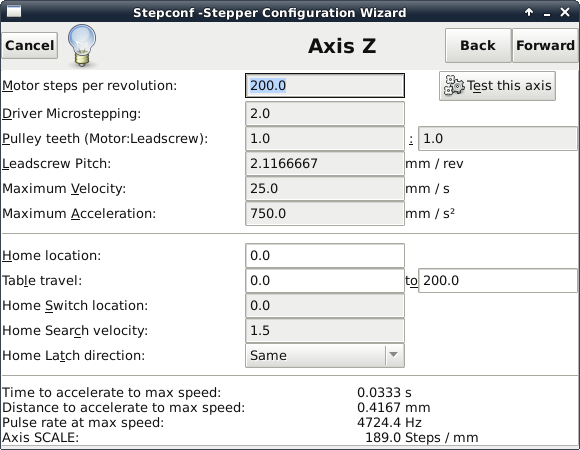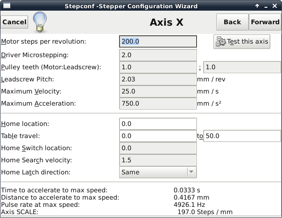 I am using a DB25-1205 BOB with a DQ542MA Driver. I know that it works because I can use it with Mach3, but when I switch over to Linuxcnc the motors will charge and hold but will not move with the “test this axis” in the setup.