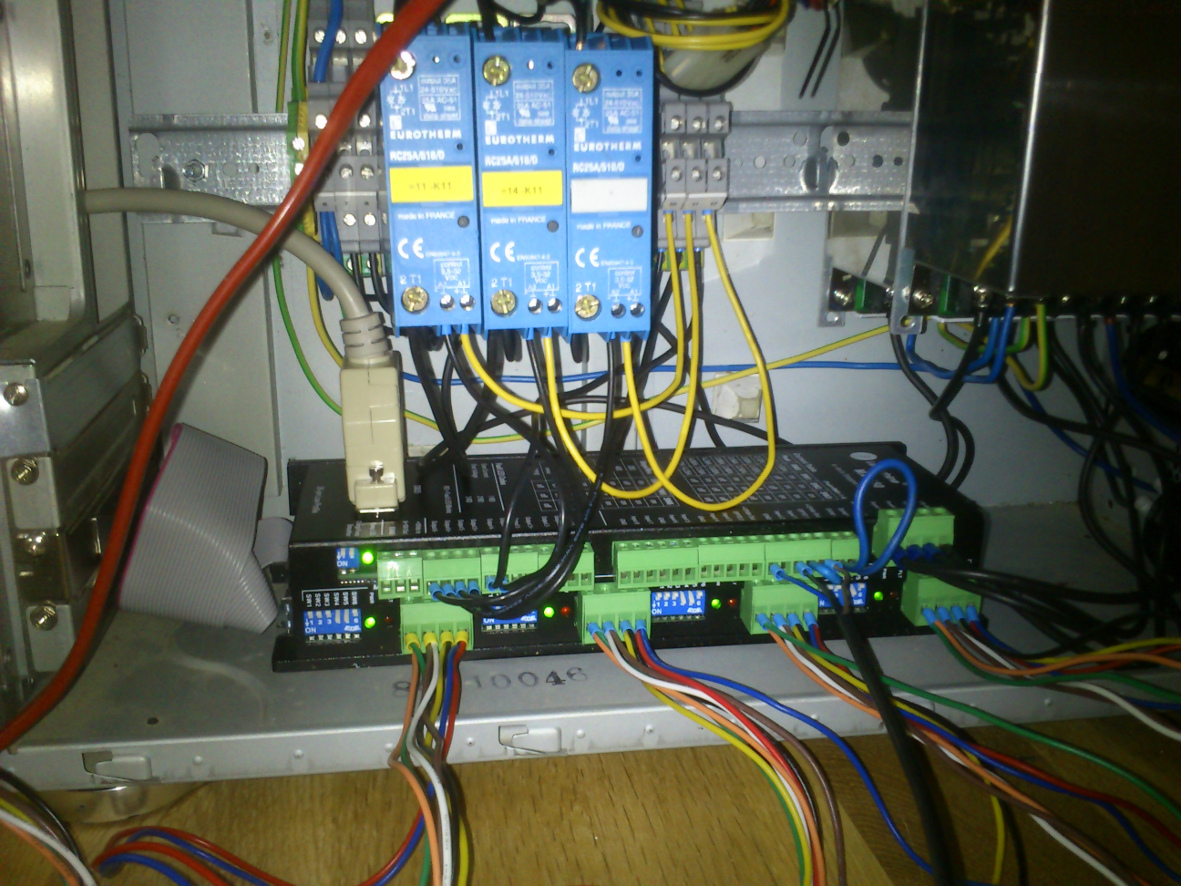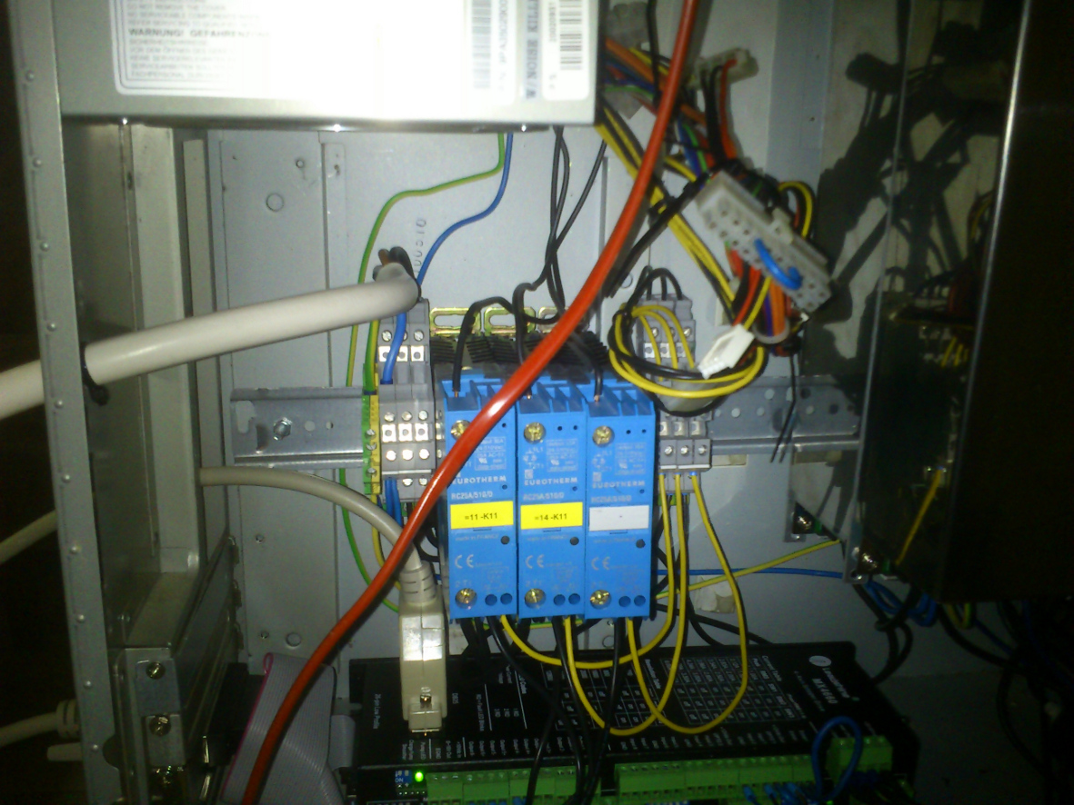 We wired the motors and 1 of the 4 proximity switches. The problem is now, that I want to have the cleaner, the vacuum pump and the spindle controlled by relays. But when I turn on the Linuxcnc Computer first, it sends a high signal to the Output connection, that means, the relays stay tuned until I start Linuxcnc itself. Have you got any idea how to keep the signal low?