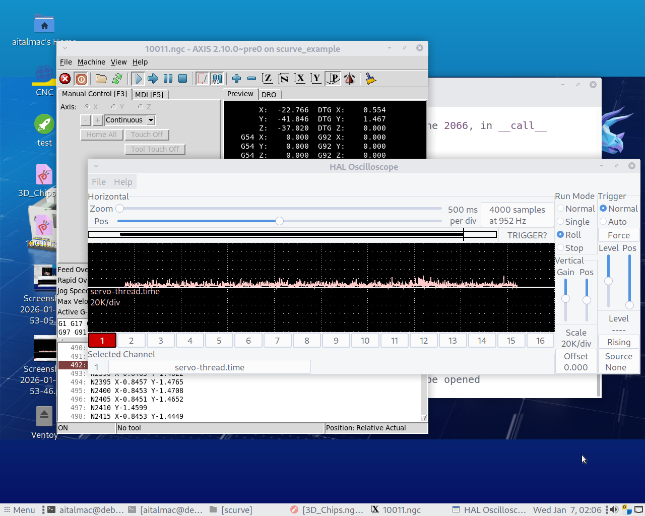 On our system I see way more spikes when moving windows around, opening glxgears, or even simply having halscope in view rolling the servo-thread, when halscope is minimized I have way less spikes to 20k compared to when I run either g-code you supplied. There is a catch I can only see that I was having less spikes AFTER I restore halscope in view, and then the spikes start again, making me conclude that the act of checking the spikes with halscope introduces more spikes than anything we are doing with the S-curve or trapez TPs, but I repeat in my testing our S-curve is more computationally efficient than normal trapez TP