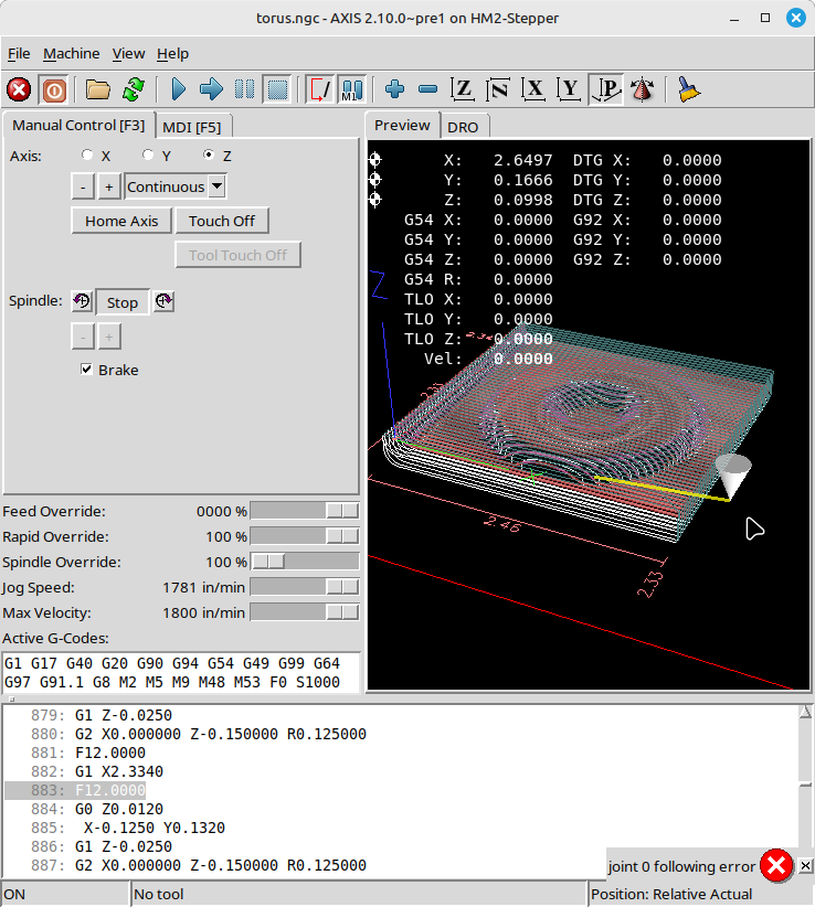 Yet running this code in G61.1 modeG21 F5000 G0 x0 y0 g1 x20 y20 x0 y0 m2 I get this: [attachment=74126]Screenshot from 2026-01-27 10-31-48.png[/attachment] here is my ini file: [spoiler] # This file was updated with the Mesa Configuration Tool on Nov 25 2025 13:43:50 # Changes to most things are ok and will be read by the Configuration Tool [MESA] VERSION = 2.1.8 BOARD = 7i95 BOARD_NAME = 7i95t [EMC] VERSION = 1.1 MACHINE = test_setup DEBUG = 0x00000000 [HM2] DRIVER = hm2_eth ADDRESS = 192.168.1.121 [DISPLAY] DISPLAY = axis PROGRAM_PREFIX = ./nc_files POSITION_OFFSET = RELATIVE POSITION_FEEDBACK = ACTUAL MAX_FEED_OVERRIDE = 1.2 MIN_LINEAR_VELOCITY = 0.0 DEFAULT_LINEAR_VELOCITY = 150.0 MAX_LINEAR_VELOCITY = 300.0 CYCLE_TIME = 0.1 INTRO_GRAPHIC = emc2.gif INTRO_TIME = 0 OPEN_FILE = ./square.ngc EDITOR = gedit DEFAULT_ANGULAR_VELOCITY = 18000 MAX_ANGULAR_VELOCITY = 36000 MIN_ANGULAR_VELOCITY = 1 [KINS] KINEMATICS = trivkins JOINTS = 2 [EMCIO] CYCLE_TIME = 0.100 TOOL_TABLE = tool.tbl [RS274NGC] PARAMETER_FILE = parameters.var [EMCMOT] EMCMOT = motmod COMM_TIMEOUT = 1.0 SERVO_PERIOD = 1000000 [TASK] TASK = milltask CYCLE_TIME = 0.010 [TRAJ] COORDINATES = XY LINEAR_UNITS = mm ANGULAR_UNITS = degree MAX_LINEAR_VELOCITY = 200.0 PLANNER_TYPE = 1 MAX_LINEAR_JERK = 1000.0 DEFAULT_LINEAR_JERK = 500.0 [HAL] HALFILE = main.hal [AXIS_X] MIN_LIMIT = 0 MAX_LIMIT = 300 MAX_VELOCITY = 300 MAX_ACCELERATION = 800 [JOINT_0] CARD = 0 MIN_LIMIT = 0 MAX_LIMIT = 300 MAX_VELOCITY = 300 MAX_ACCELERATION = 800 MAX_JERK = 1000.0 TYPE = LINEAR SCALE = 252.65 STEPGEN_MAX_VEL = 360.00 STEPGEN_MAX_ACC = 960.00 DIRSETUP = 10000 DIRHOLD = 10000 STEPLEN = 4000 STEPSPACE = 4000 ENCODER_SCALE = 200 FERROR = 1.5 MIN_FERROR = 0.25 DEADBAND = 0.01 P = 1000 I = 0 D = 0 FF0 = 0 FF1 = 1 FF2 = 0 BIAS = 0 MAX_OUTPUT = 0 MAX_ERROR = 0.0127 HOME_OFFSET = -0.75 HOME = 0 HOME_SEARCH_VEL = -5 HOME_LATCH_VEL = -5 HOME_FINAL_VEL = 2.5 HOME_IGNORE_LIMITS = YES HOME_SEQUENCE = 0 [AXIS_Y] MIN_LIMIT = 0 MAX_LIMIT = 300 MAX_VELOCITY = 300 MAX_ACCELERATION = 800 [JOINT_1] CARD = 0 MIN_LIMIT = 0 MAX_LIMIT = 300 MAX_VELOCITY = 300 MAX_ACCELERATION = 800 MAX_JERK = 1000.0 TYPE = LINEAR SCALE = 252.65 STEPGEN_MAX_VEL = 360.00 STEPGEN_MAX_ACC = 960.00 DIRSETUP = 10000 DIRHOLD = 10000 STEPLEN = 4000 STEPSPACE = 4000 ENCODER_SCALE = 200 FERROR = 1.5 MIN_FERROR = 0.25 DEADBAND = 0.01 P = 1000 I = 0 D = 0 FF0 = 0 FF1 = 1 FF2 = 0 BIAS = 0 MAX_OUTPUT = 0 MAX_ERROR = 0.0127 HOME_OFFSET = 0.25 HOME = 0 HOME_SEARCH_VEL = -5 HOME_LATCH_VEL = -5 HOME_FINAL_VEL = 2.5 HOME_IGNORE_LIMITS = YES HOME_SEQUENCE = 0 [/spoiler] What am I missing?