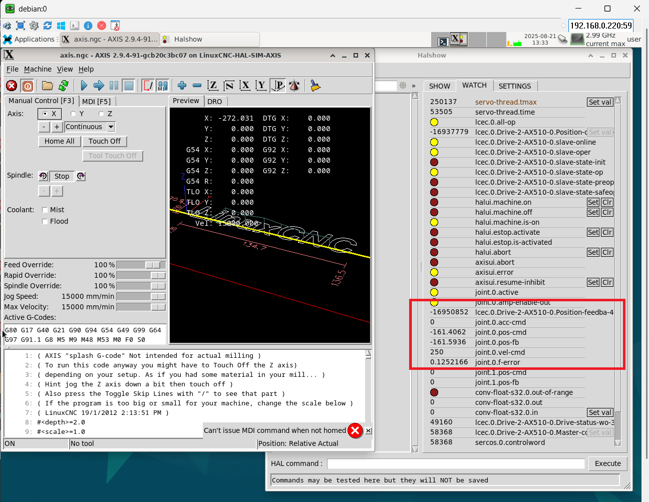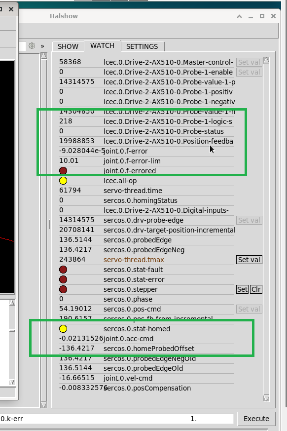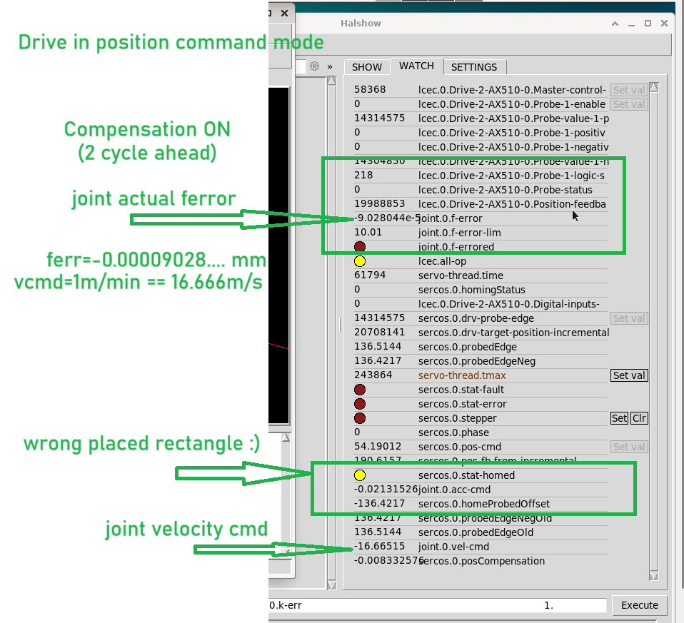 I tested it with Nidec N753(it has 0x60B1 avaible - but i did not implement the offset yet), Kollmorgen S343, Kollmorgen S7xx, Pilz pmcTendo, Beckhoff AX5106 hw2(https://codeberg.org/endian/Beckhoff_AX5ZYZZ_lcec_driver - here is working driver for AX5YZZ drivers with sercos.comp which is very similar to dominik cia's but only for AX with external trapeziodal homing based of high speed probing hw-input outside of master[lower cycle time at fpga]), Beckhoff el7221 and I will test it with @zmrdko's Delta ASDA drivers too ... pictures shows like that solution synchronize of timing lag of position mode of ethercat