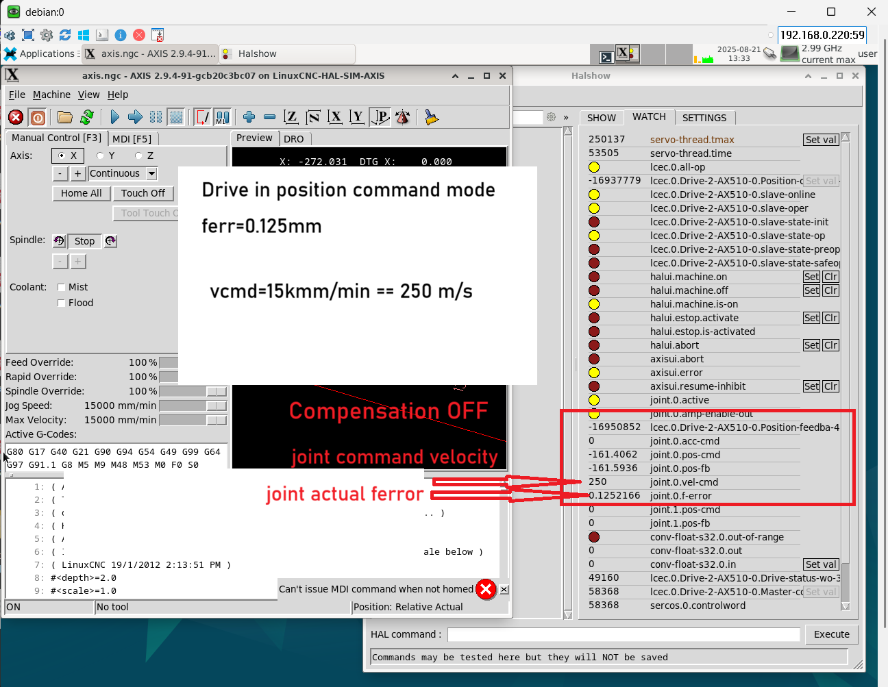 I can just customize current images to show exact difference ... compensation off ferror = 0.125mm at 15m/min ... compensation on ferror = 0.00009028mm at 1m/min and multiply it by 15 we get 0,0013542mm which is significantly less then 0.125 ..