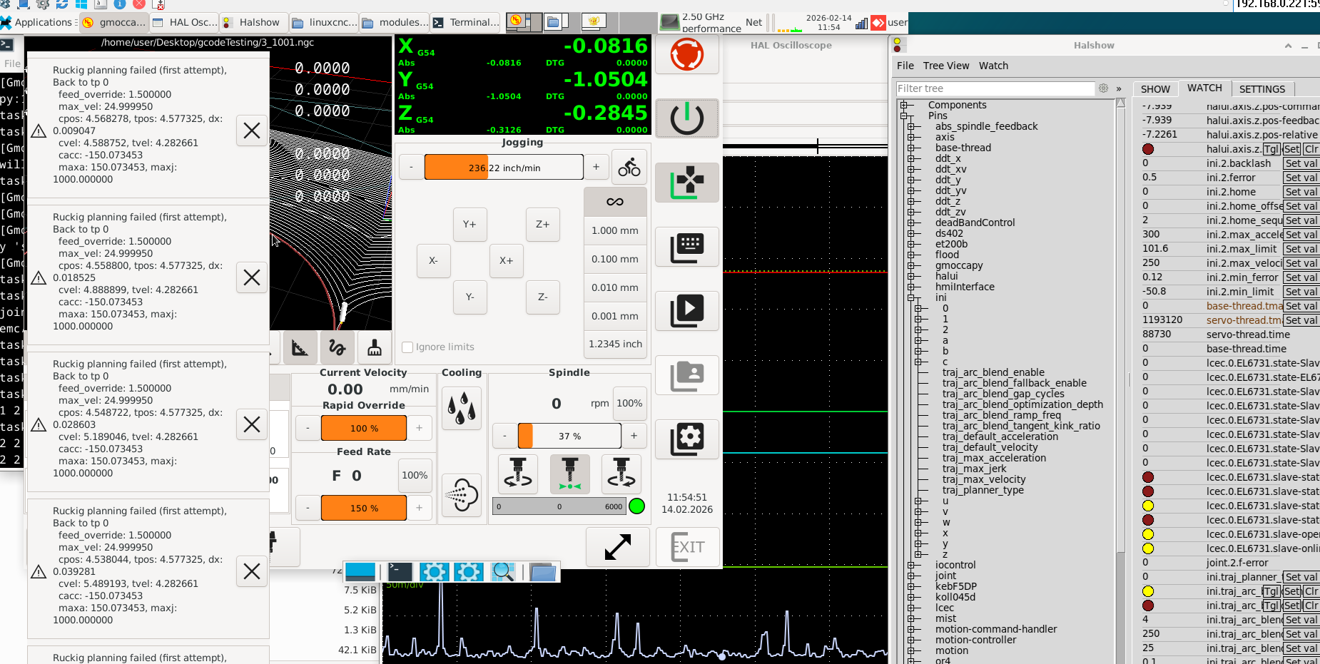 some testing fault popups triggered during the movement of file 3_1001.ngc