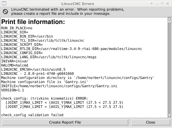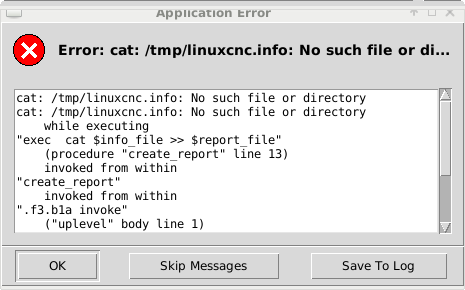 I will attach the current .hal. and .ini files and also part of an Axis error report and part of a resultant error report which always occurs when I click the button on the axis error report to "generate a report". When I look it the directory /tmp there are many new files and I will attach the linuxcnc.report and the linuxcnc.info.txt files.