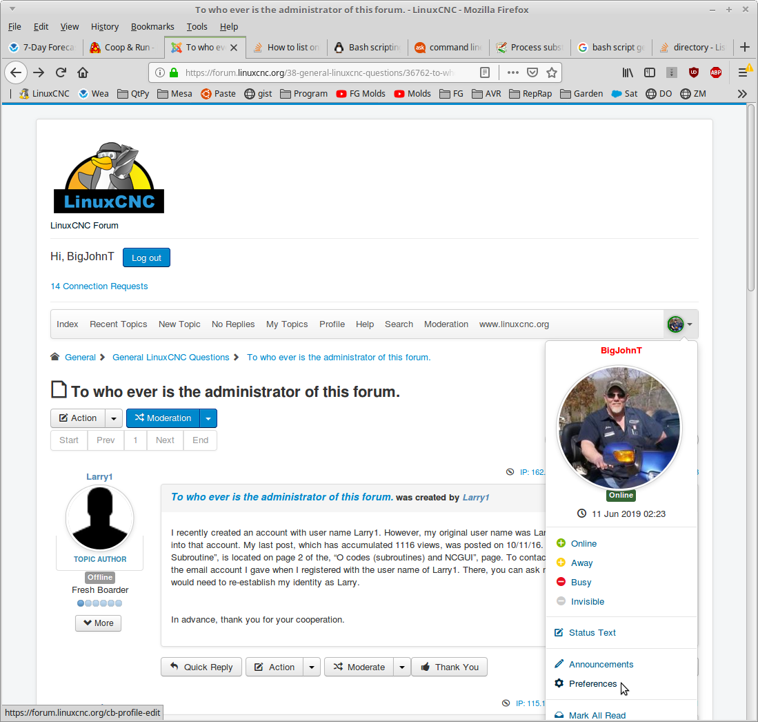 I recently created an account with user name Larry1. However, my original user name was Larry. I lost all of the info to get back into that account. My last post, which has accumulated 1116 views, was posted on 10/11/16. The title of which is, “Spiral Subroutine”, is located on page 2 of the, “O codes (subroutines) and NCGUI”, page. To contact me, please send me an email to the email account I gave when I registered with the user name of Larry1. There, you can ask me to supply any information you would need to re-establish my identity as Larry.