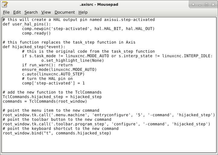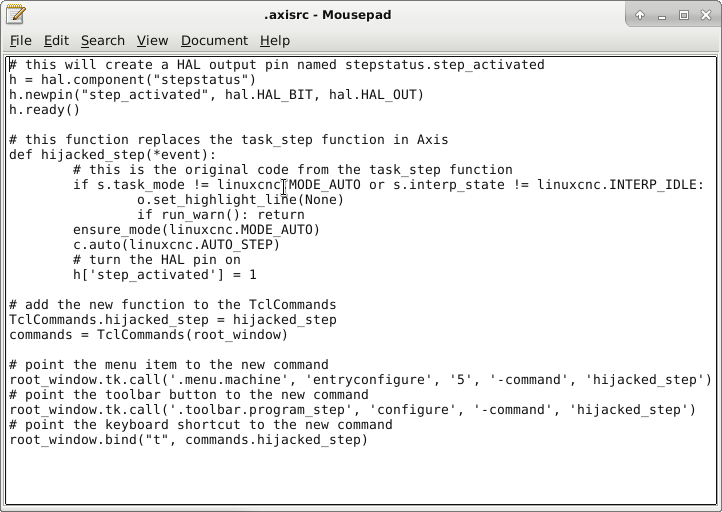I finally got around to trying your code by pasting it into a .axisrc file. When I run Hal Configuration within LinuxCNC, I don't see the step-activated pin anywhere in the tree. Should I be able to see it somewhere?